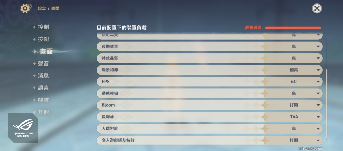 像我們以超需要效能的原神來舉例,阿湯先把效果全開,FPS 也選為 60。