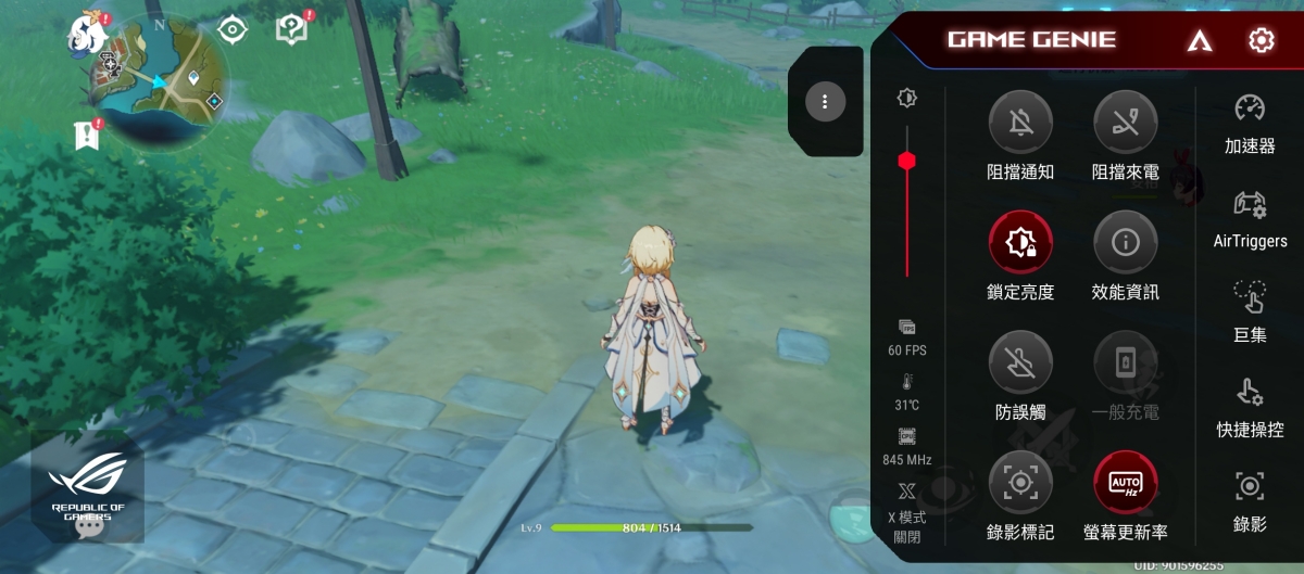 有啟動遊戲精靈的情況下,玩遊戲時隨時可以叫出遊戲工具列,包括有加速器、AirTriggers、巨集、快捷操控跟錄影, 也可以調整螢幕更新率,更重要的是可以即時查看目前遊戲執行的幀率是多少,像阿湯開啟原神玩一陣後隨時查看幀率都是穩穩維持在 60FPS,真不愧是調校超好的 ROG Phone 5s Pro,如果連原神都能順暢的遊戲,還有什麼不行的?