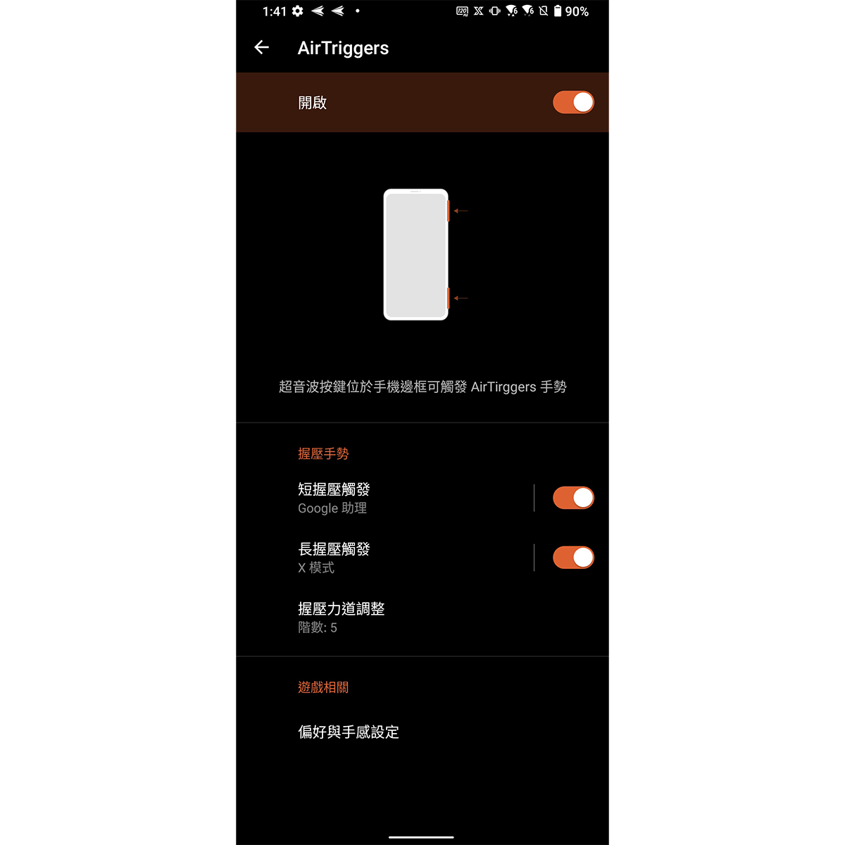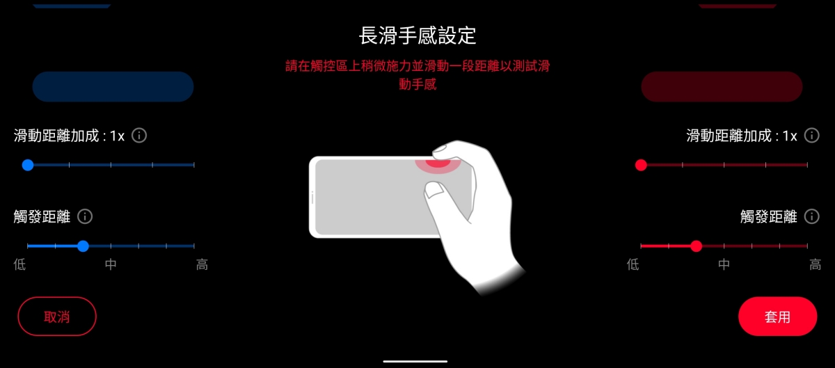 針對遊戲相關的設定,也能再進一步的設定觸發速度、按鍵的手感,更特別的是還有滑動手感的設定,所以單這個超音波觸控鍵就有相當多元的操作方式,再加上 ROG Phone 5s Pro 還有專屬的後置觸控鍵及風扇實體專用鍵,操作方式真的相當多元。