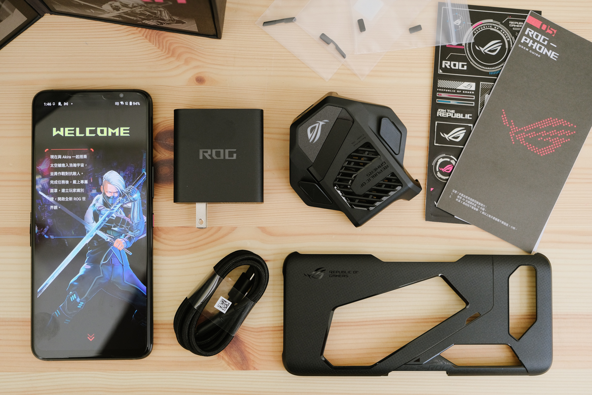 盒裝標配有支援 65W 的變壓器、USB Type-C 充電線、外接空氣動力風扇 5、貼紙、手機保護殼、說明書、防塵蓋及卡針。