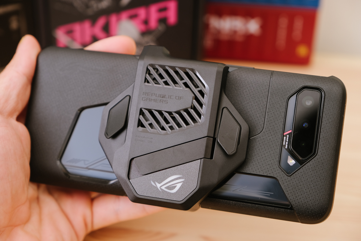 這個具有散熱效果的外接空氣動力風扇,官方測試透過這樣的搭配可以讓手機的表面溫度降低 15 度,特別是 ROG Phone 5s Pro 的 CPU 改為中置設計,讓 CPU 溫度透過外接動力風扇可以降低達 10 度,差異相當的大,背面也還有二個實體按鍵可以搭配使用(這 ROG Phone 擴充按鍵是否多的太方便)。