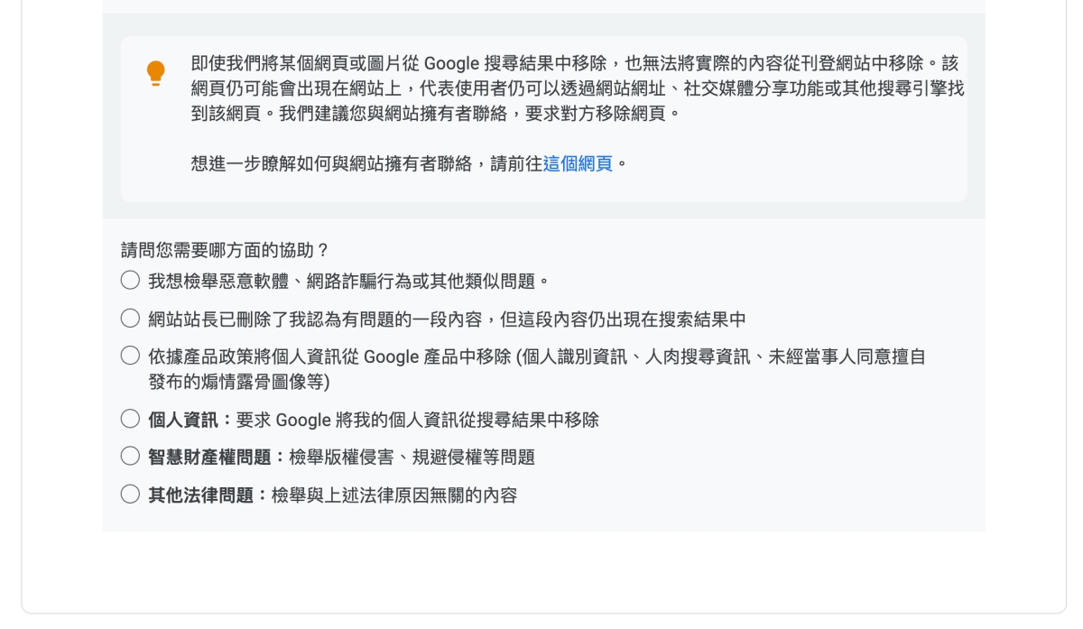 網址:https://support.google.com/legal/troubleshooter/1114905?hl=zh-Hant