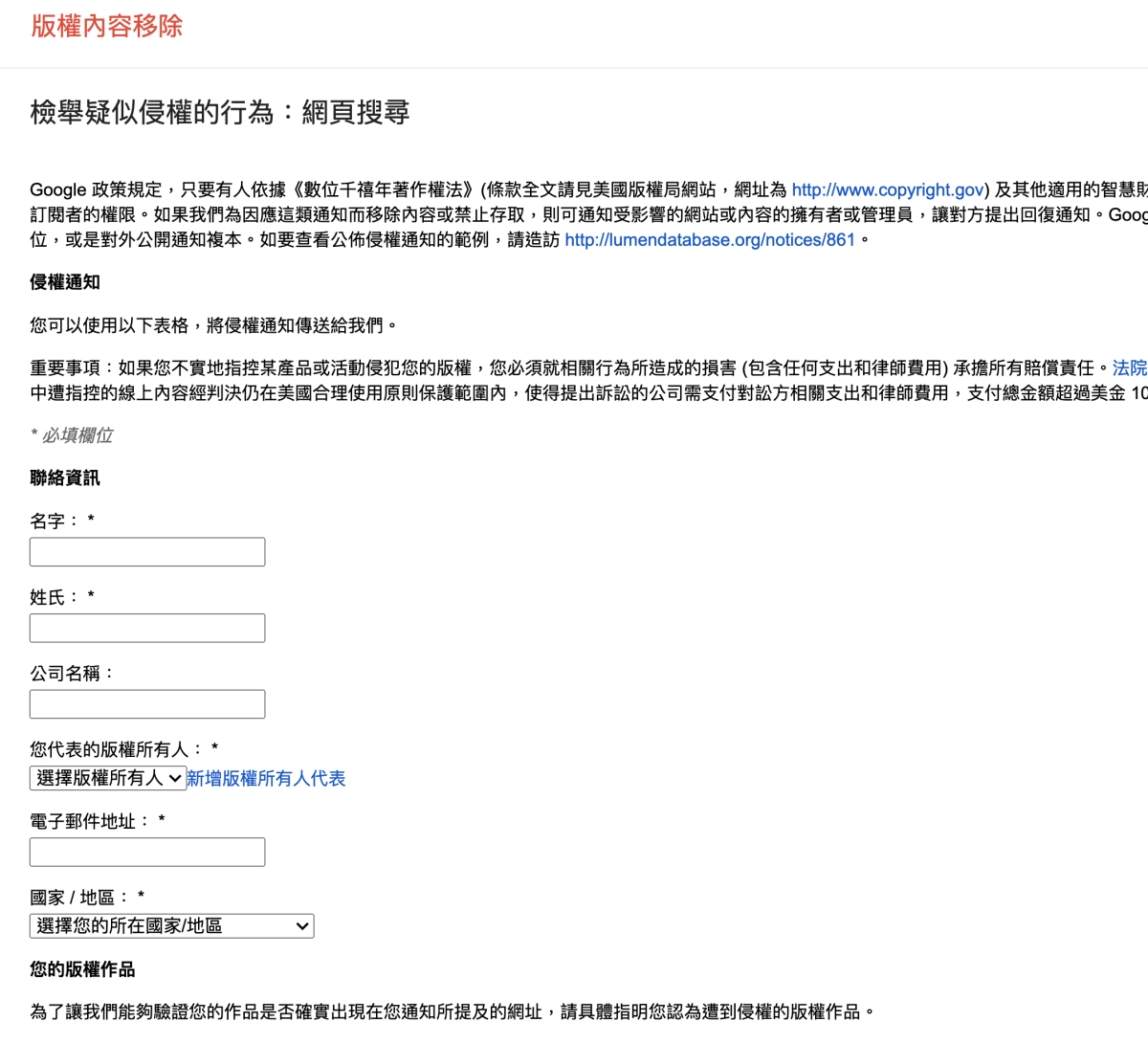 然後填寫相關資料以及描述侵權的行為,最後送出後就可以等待 Google 處理回報了,但如果你的內容或圖片是在台灣被盜用,且明確的知道對方是誰,可以先私下和解,如果對方不願處理或理賠,那麼就搜證後向保智提出申訴吧。