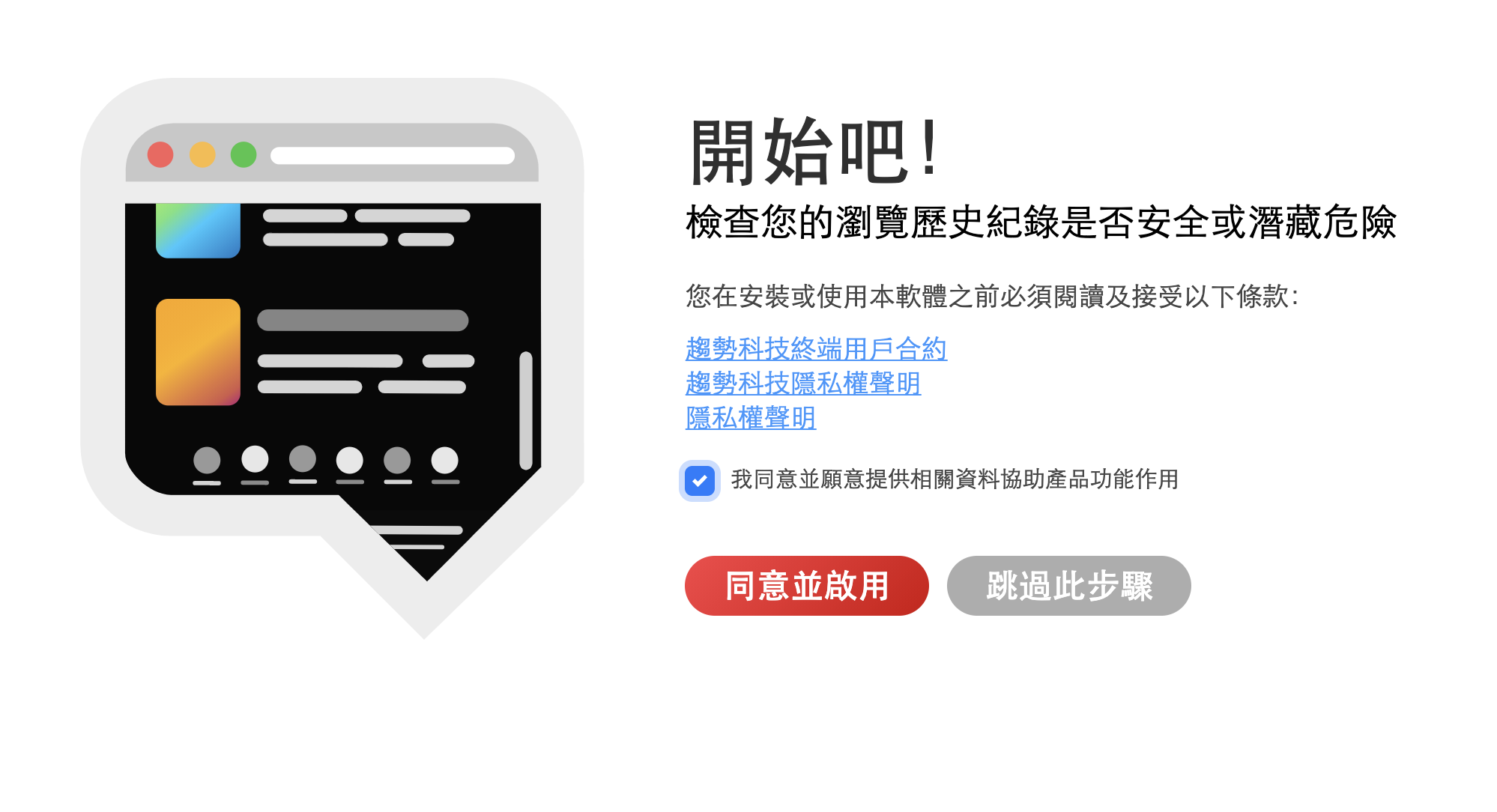 第一次啟用完成後,會顯示這個畫面,除了讓你了解目前有沒有到過具有風險的網站外,也讓你知道趨勢科技防詐達人可以幫你做些什麼,我們就一個個來查看。