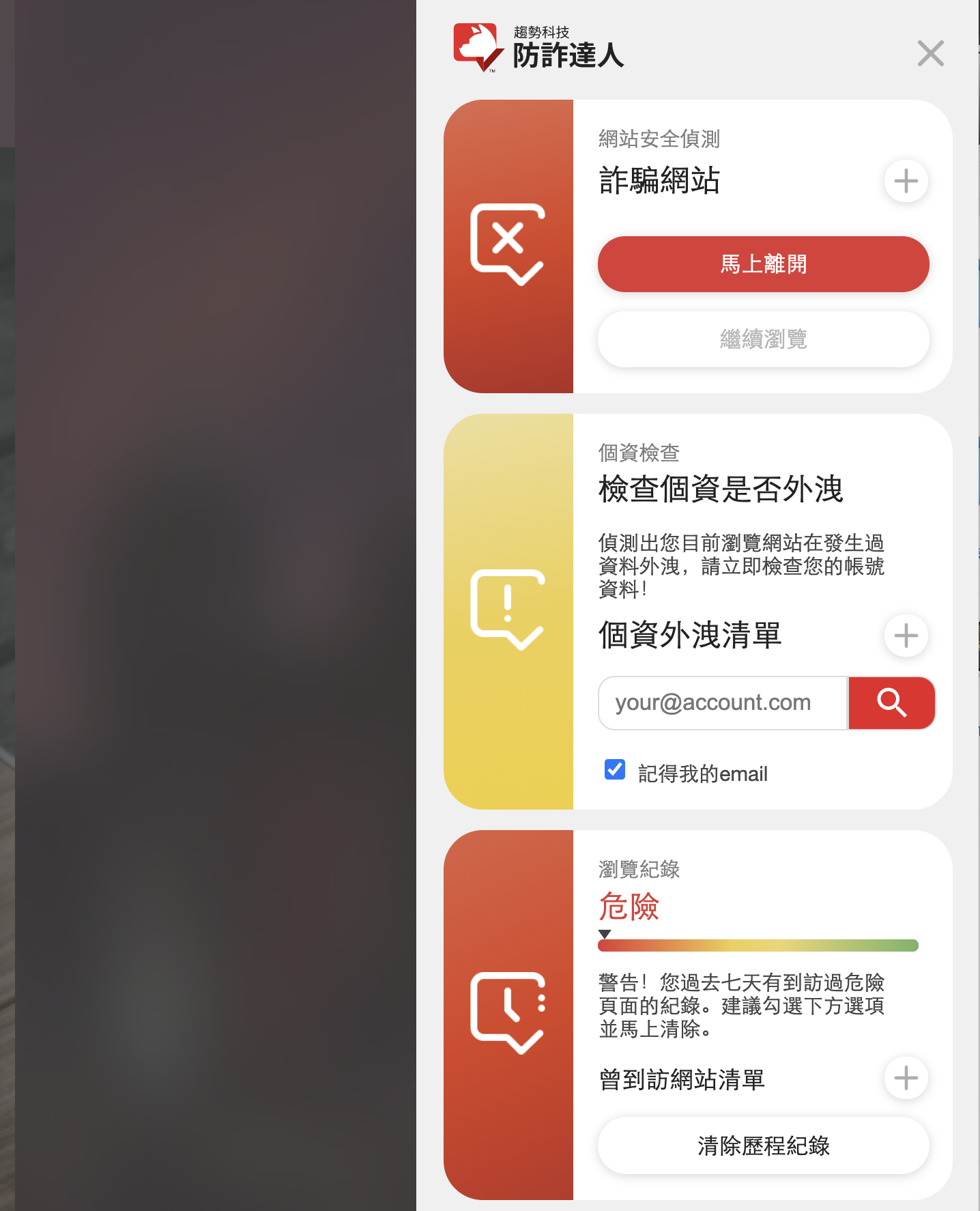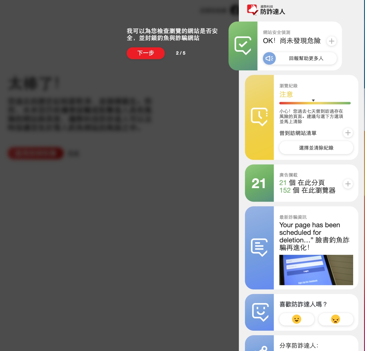 除了剛一開始的歷史紀錄健檢及清理外,首先第一個功能就是「網站安全偵測」,如同前面所提到的,會幫你即時的偵測及封鎖釣魚、詐騙網站,只要一進到這樣具有風險的網頁就會立即跳出警示。