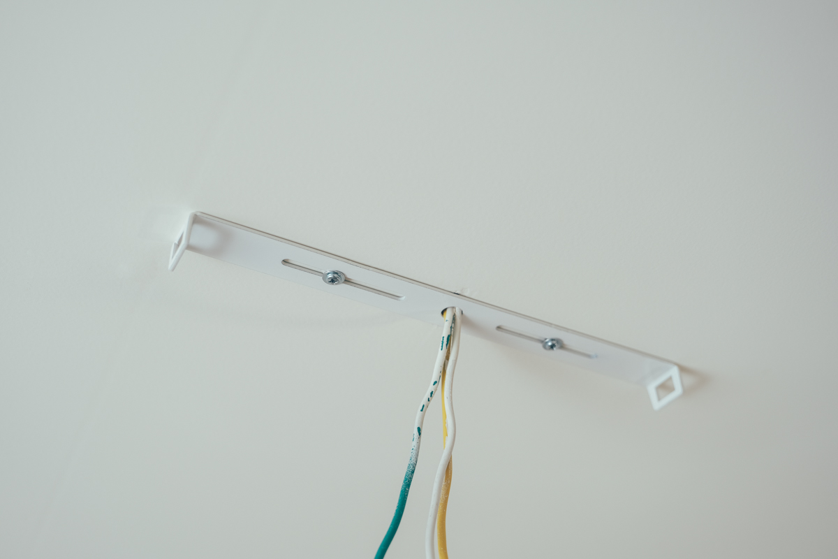 就像這樣把支架先鎖上天花板(記得要將電源關閉,這樣電線正常應該都是不帶電,可以直接觸摸)。