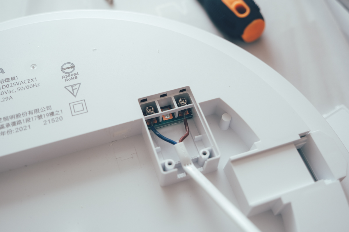 接下來是安裝電源線,阿湯是推薦可以將接線盒打開後,直接將天花板的電線接上去鎖緊就好,這樣就不需要電源線對接還要包電火布膠帶。