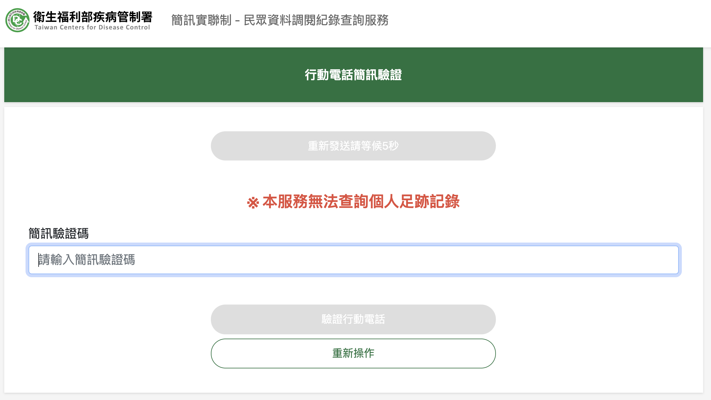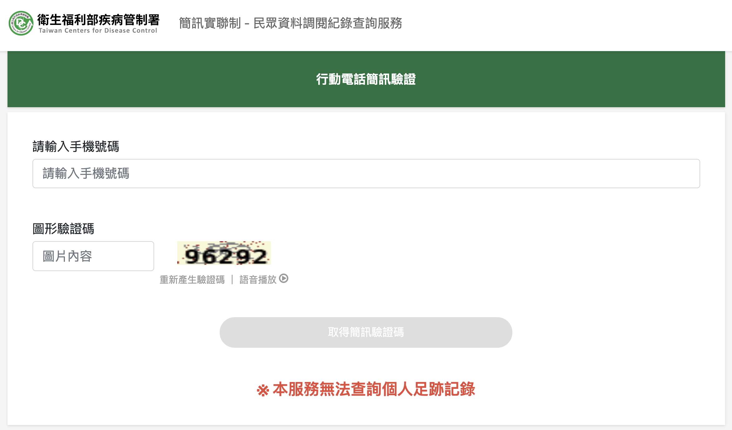 網站:https://sms.1922.gov.tw/進入網頁後輸入手機號碼及圖形驗證碼後下一步取得簡訊驗證碼。