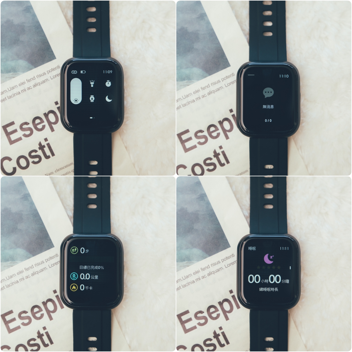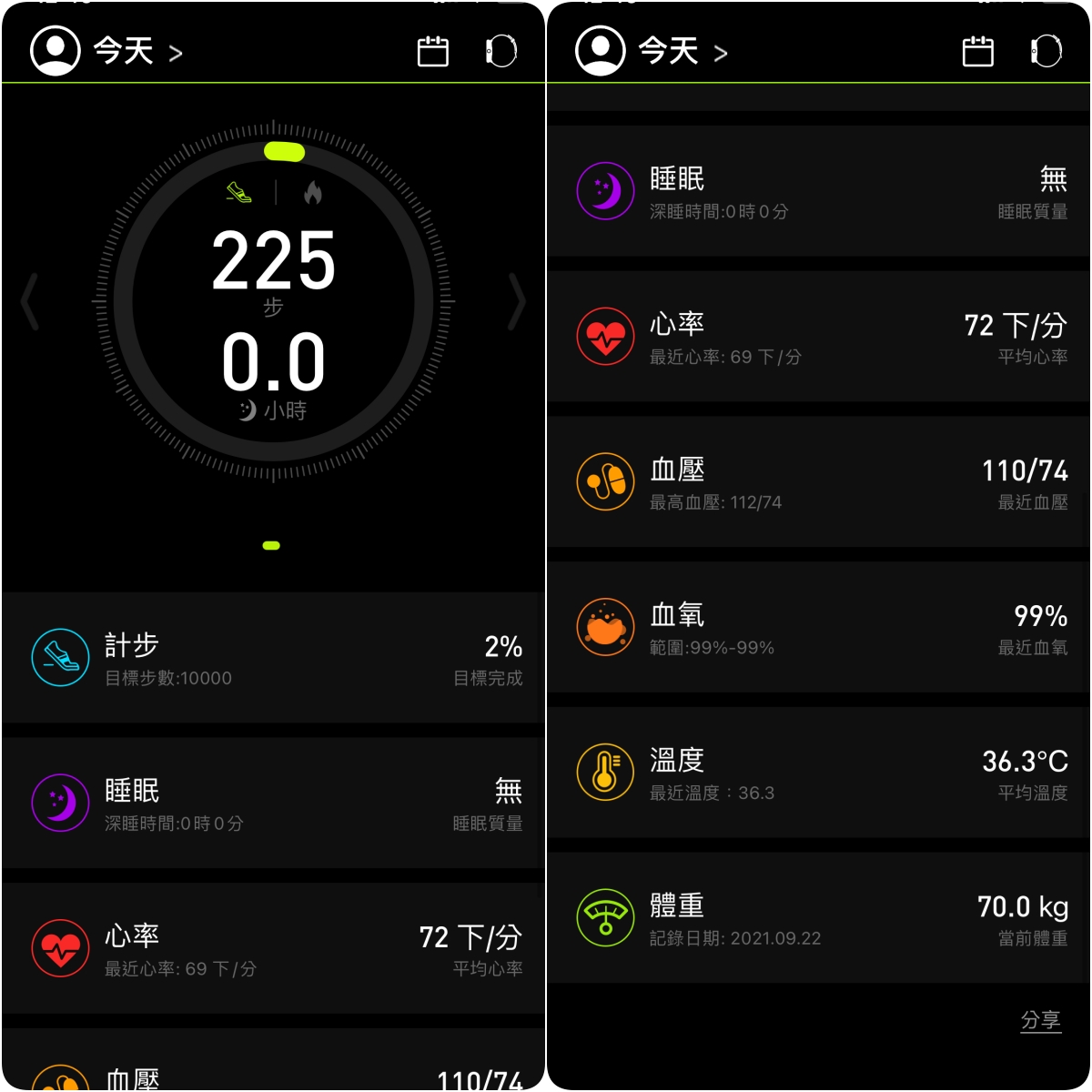 - 由左往右(或反之):行走步數(消耗卡路里)、睡眠資訊、血氧、心率、血壓、溫度及音樂控制。