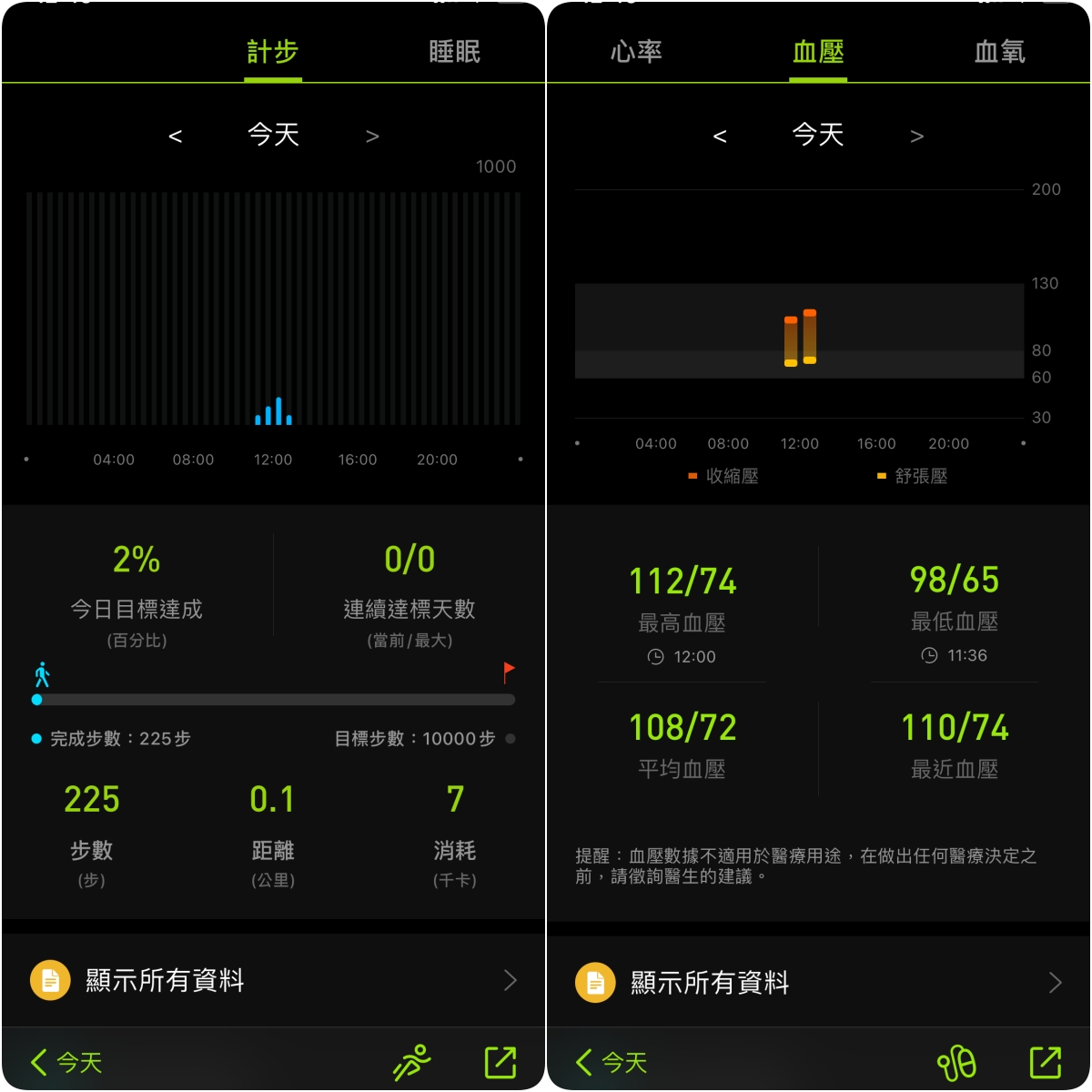 點擊進去後可以查看每一項記錄的更詳細資訊,平常大家就可以觀察自己身體長時間的數據變化,雖然智慧型手錶不像專業醫療器材那麼準確,但是做對相對值查看變化還是很有參考價值。