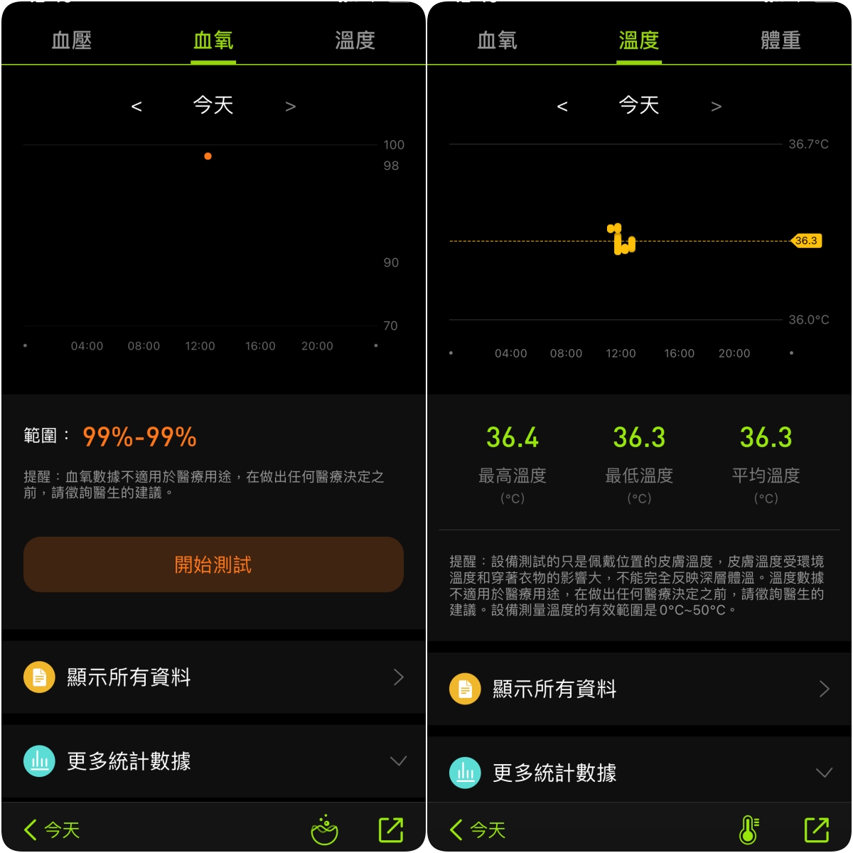 一般血壓跟體溫在平價智慧型手錶上是比較少見的,當然這些量測資訊由於智慧型手錶並非專業醫療儀器,資訊僅做為參考使用,主要大家可以看自己的數據變化是否有異常,比如原本血壓從 120 突然變成 160 維持很久,那就可能要儘速就醫,所以做為「相對參考值」,仍然有非常大的用處。