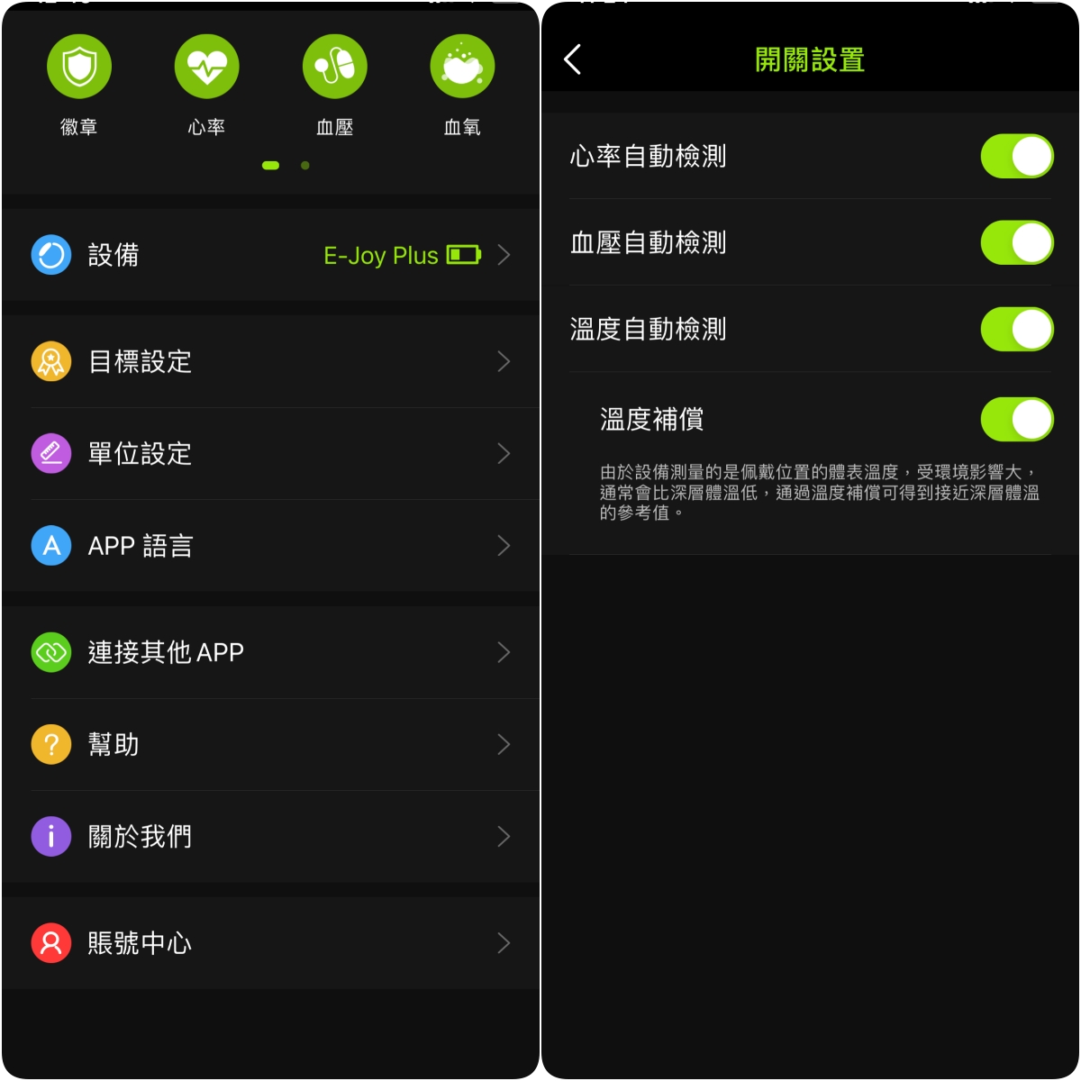 在預設的情況下,血壓及溫度不會開啟動檢測,中如果你想要 24 小時自動定時檢測的話,可以在開關設置裡打開(但相對也會耗電比較快),而體溫的偵測,建議要開啟溫度補償,這樣會幫你計算出更接近實際體溫的參考值。