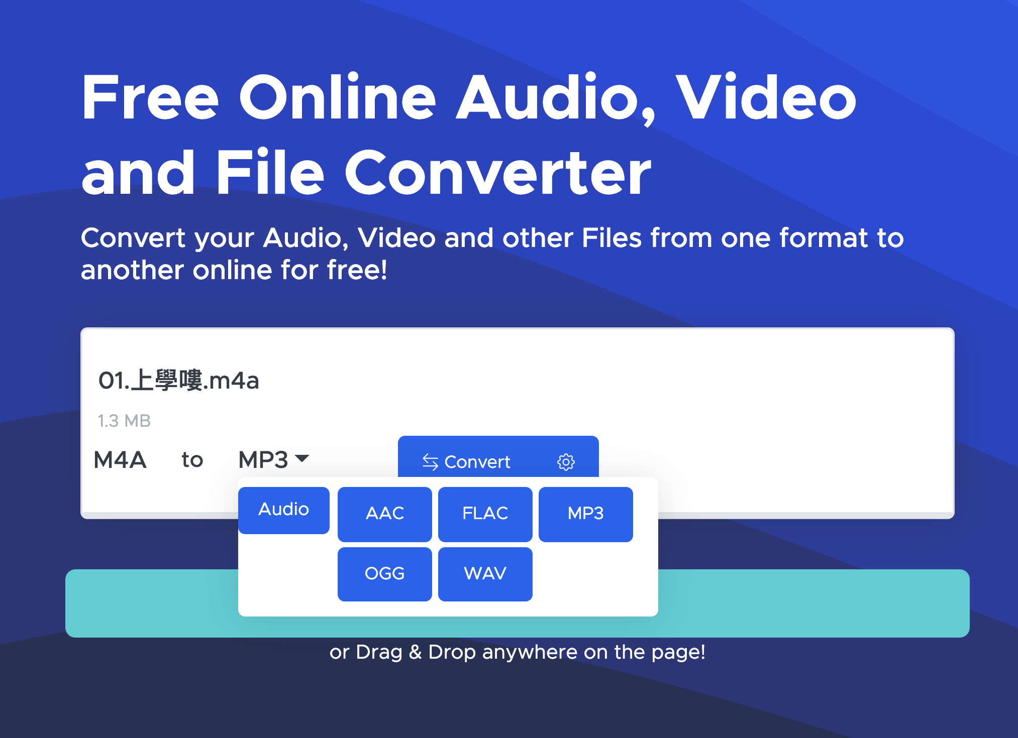 進入網站後,直接將想要轉檔的檔案拖曳進去,網站也沒很清楚的說支援哪些格式,只有說支援很多格式,但大致上試下來就是支援影片、圖片、PDF、音樂檔這幾個類型為主。