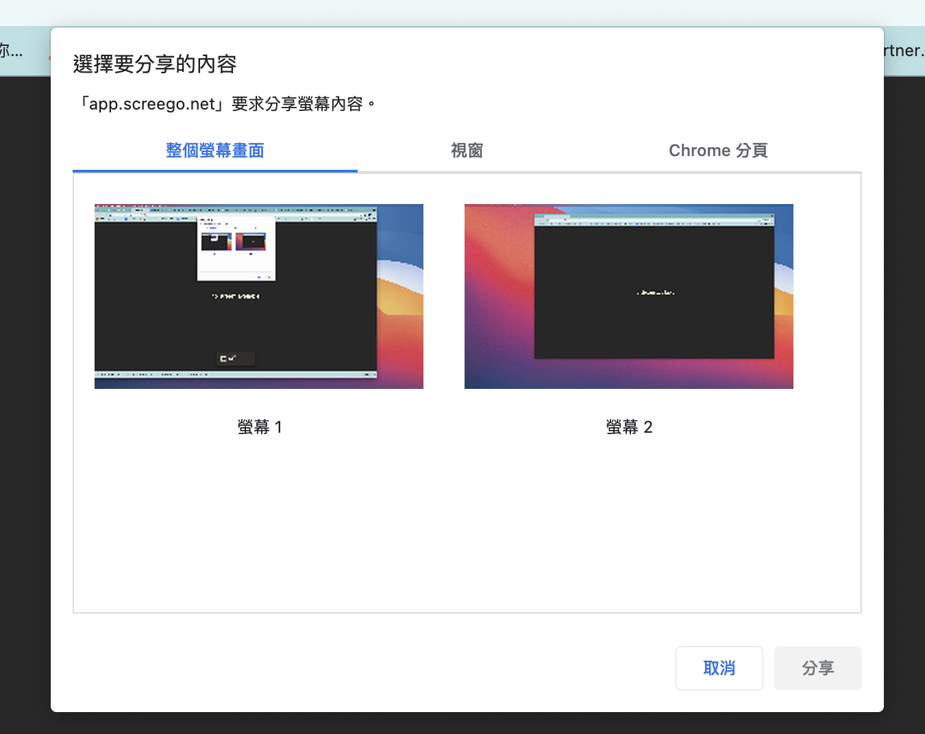 可以分享的包括自己的電腦全螢幕,或者選擇某個軟體視窗,也可以直接選擇 Chrome 的分頁(或其它瀏覽器的分頁,看你是用什麼瀏覽器),相當簡單吧。