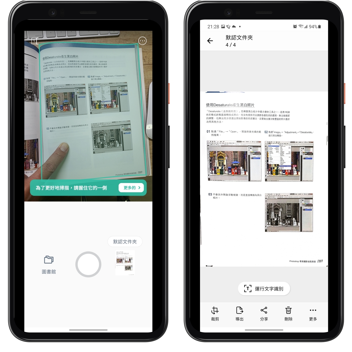 另外,如果切換成雙頁掃描模式,就可以一次對二頁掃描,會給你一個中心點,你只要對在書本中間就好,掃描出來的結果會幫你分成二頁,真的是很方便,快去試看看吧。