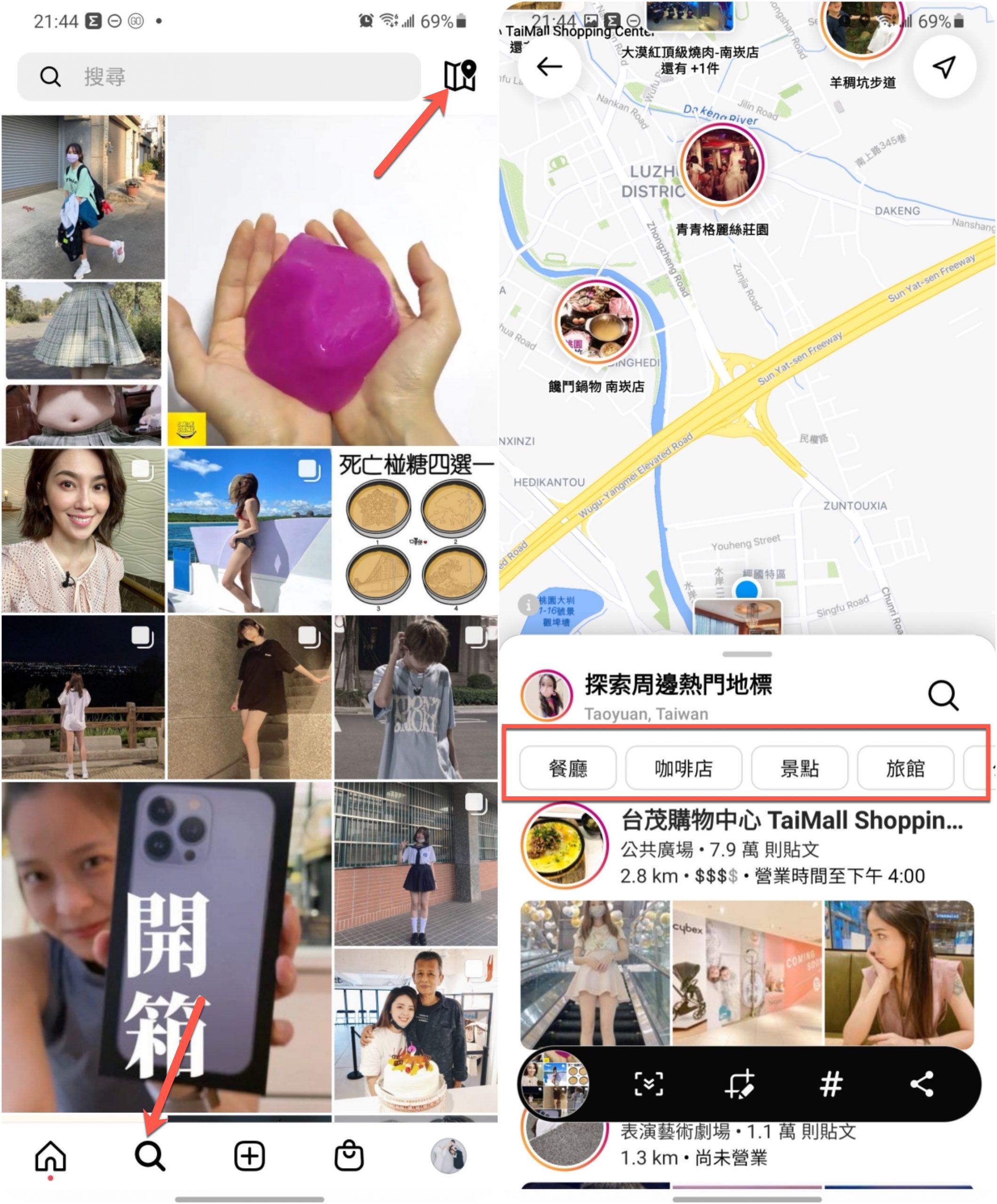 首先打開你的 Instagram 後,先點擊下方的搜尋,再點擊右上角的地圖圖示,就會進到地圖模式囉,預設就會有幾種常用的標籤分類讓你可以選擇。