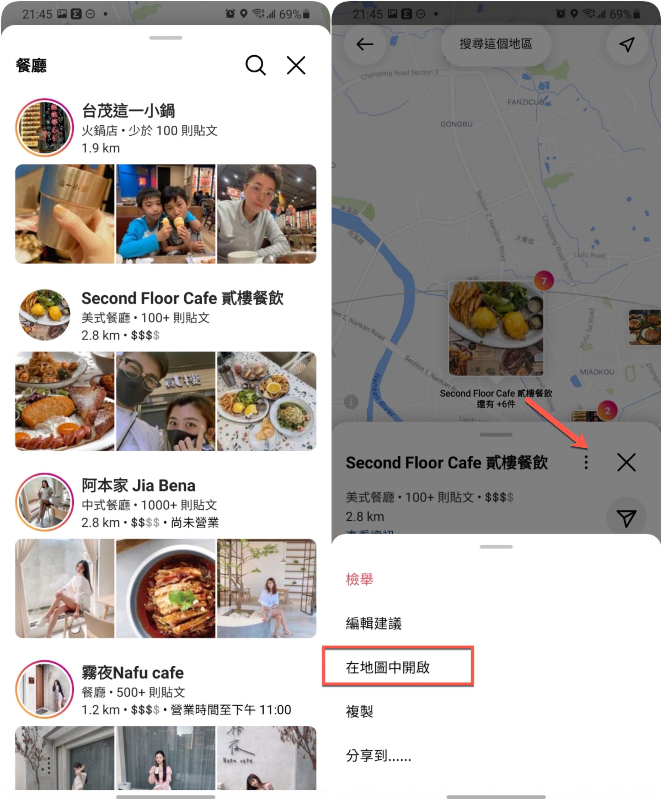 如果是選擇分類的話,就可以直接查看該類別的內容,也可以縮放區域來搜尋(跟 Google 地圖一樣),而這地圖模式也結合了地圖功能,可以在選單裡點擊「在地圖中開啟」,就能直接透過 Google 或 APPLE 地圖進行查看及導航了。