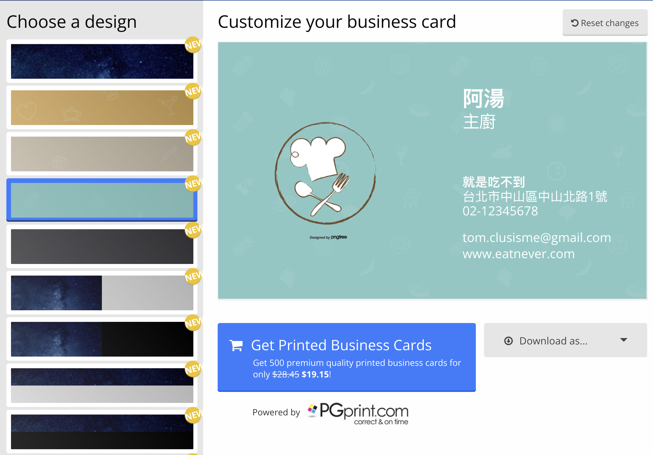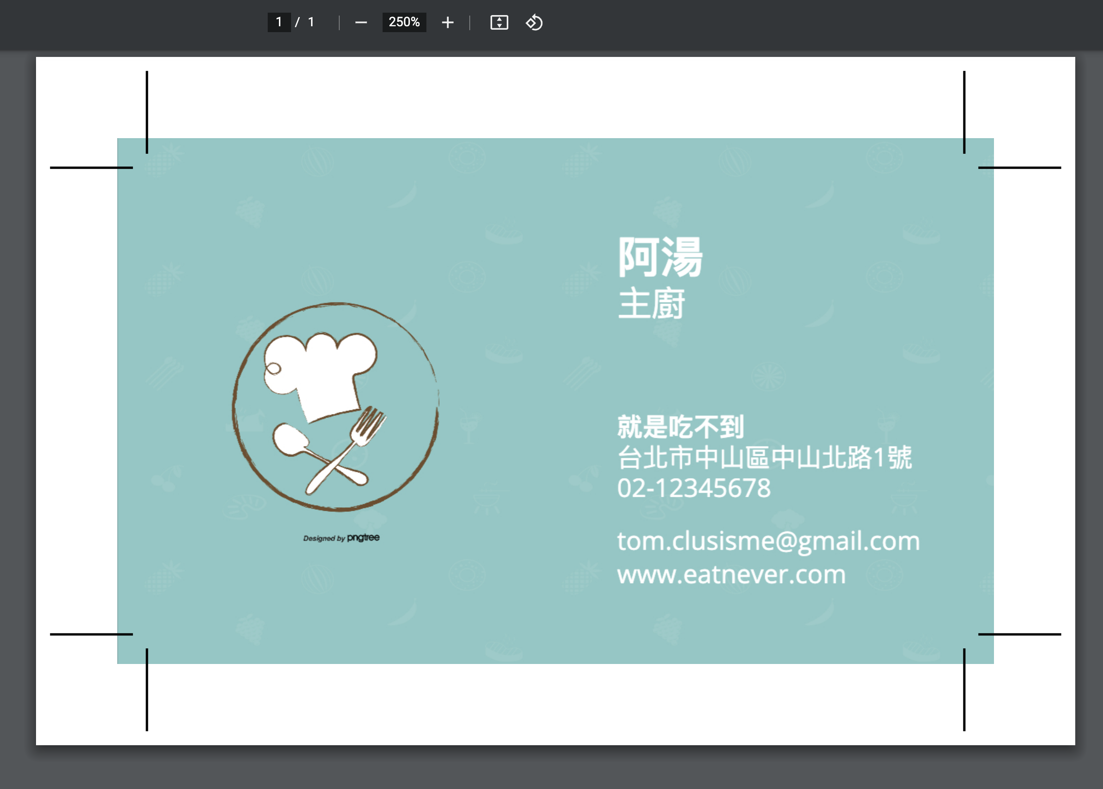 最後輸出時,可以選擇 PDF 檔案,還有幫你標記好名片的邊框線,真的還蠻不錯的,如果沒有什麼特殊需求的話,用這個做倒是蠻省錢的,Logo 就去找一些免費的 icon 網站下載就好(記得要找可以商用的)。
