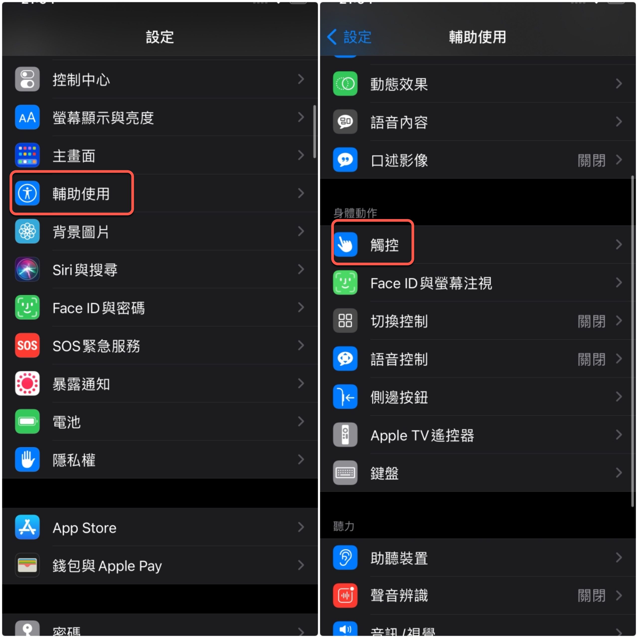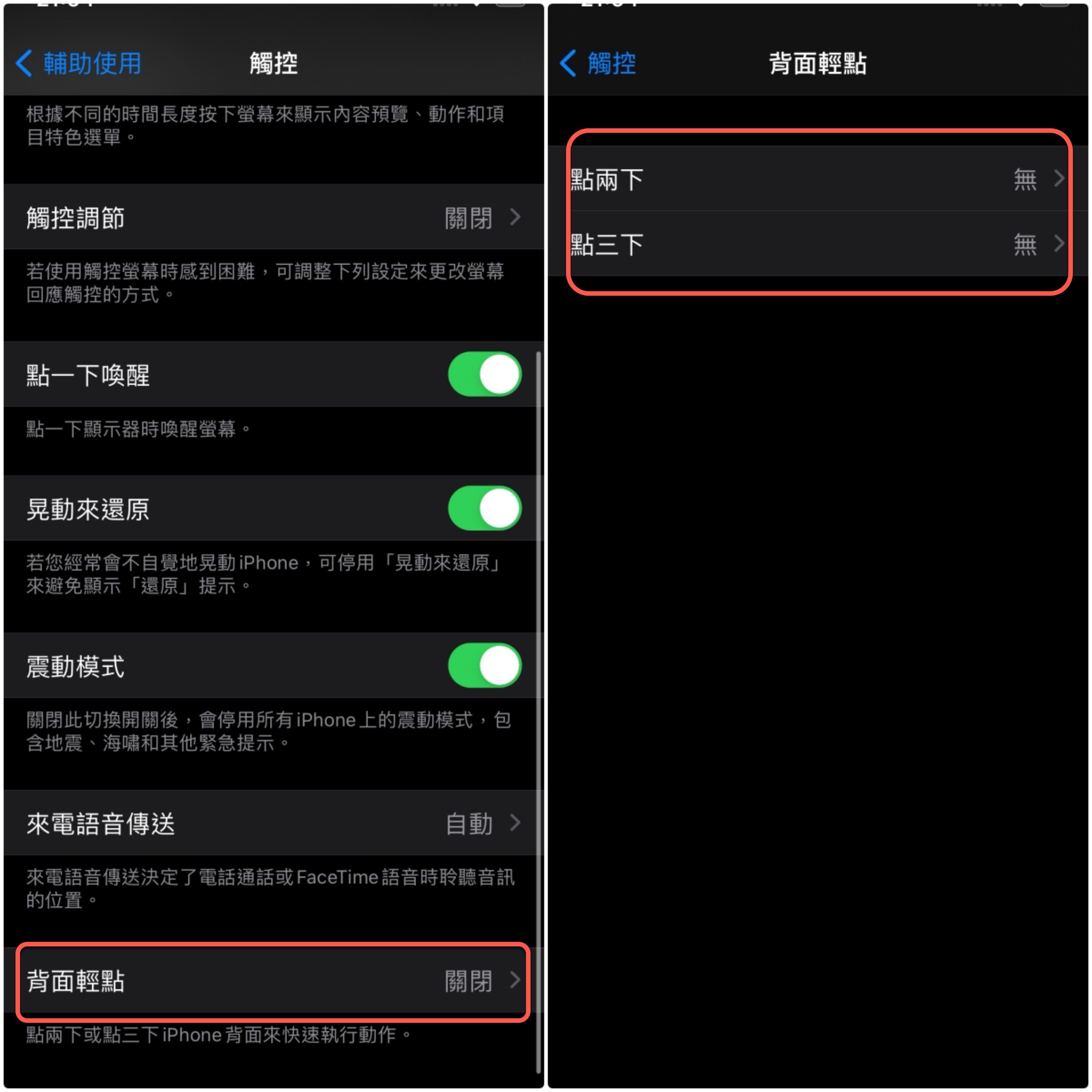 背面輕點 > 選擇點兩下或點三下(看你習慣)。