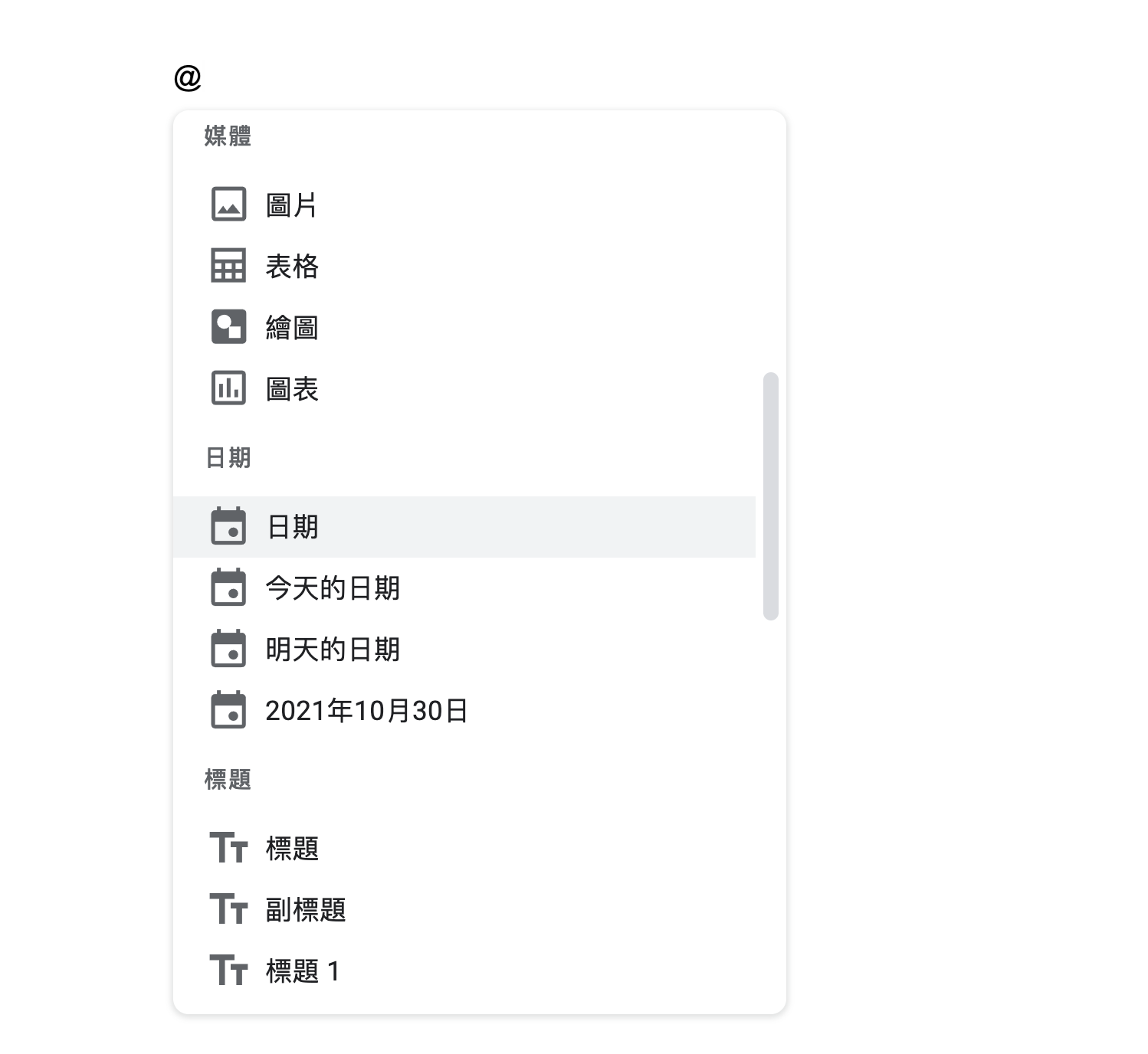 阿湯現在使用 Google 文件的次數比起 Microsoft Word 的次數,可以說是多很多,一來是用到的功能不多,幾乎都能在 Google 文件中完成需要的工作,二來是 Google 文件直接雲端作業,靠帳號就可以登入,所以我真的蠻喜歡用 Google 文件來作業,今天要來分享的是 Google 文件的一個小功能,就是「@ 功能」,只要在文件中輸入 @ 這符號時,就會自動跳出選單,讓你選擇對應的功能來使用,非常快捷實用。