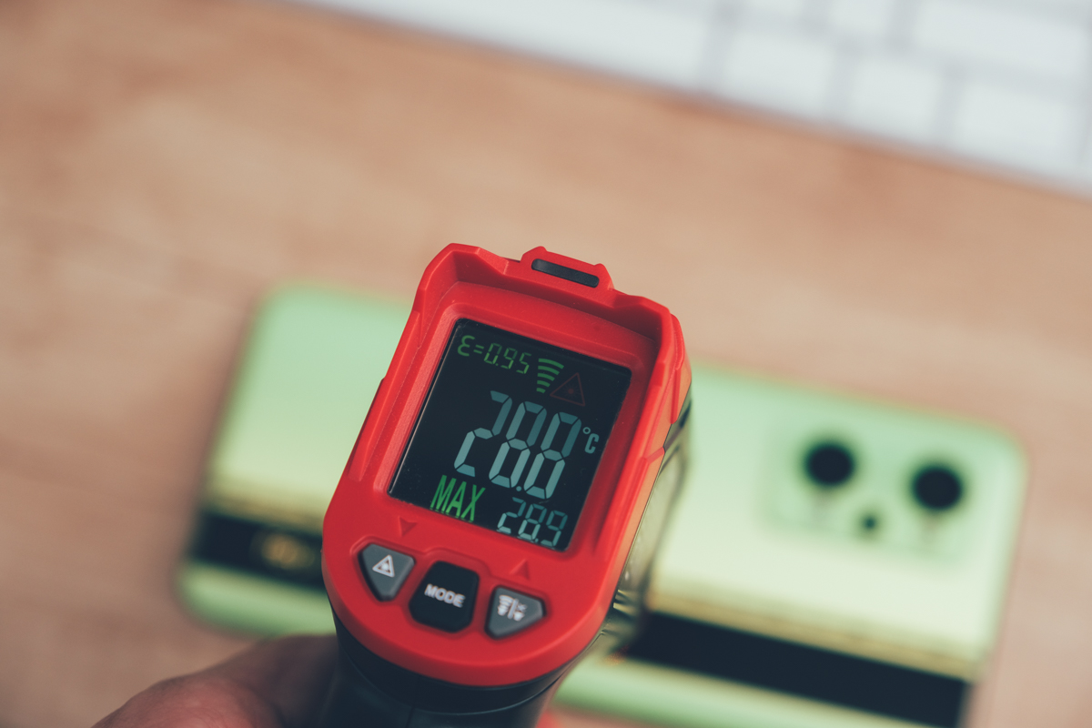 至於散熱的部份到底有多強?阿湯也實際測試給大家參考,首先這是什麼都沒做,直接用紅外線感溫槍打背面,28.8 度。