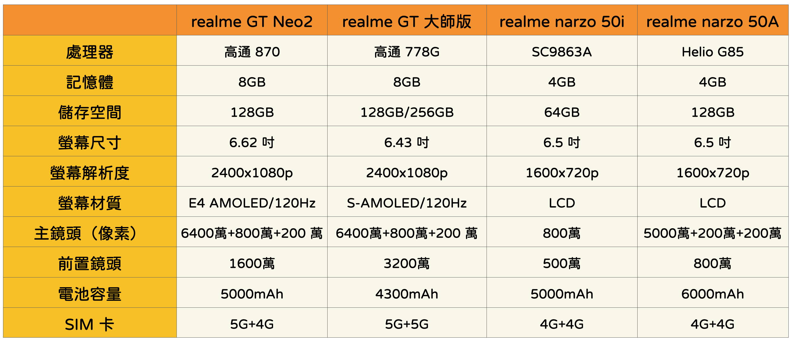 阿湯也提供上述四款手機的基礎規格比較給大家參考,包括 realme GT Neo2、realme GT 大師版、realme narzo 50i 及 realme narzo 50A,就阿湯的推薦來說,GT Neo2 及 GT 大師版,都可以適合做為主力手機使用(包括玩遊戲),而 narzo 系列二款由於續航能力極佳,價格非常親民,很適合預算有限且效能需求不夠的人入手,或者你拿來當做遊戲掛機、車用導航使用都是不錯的選擇。