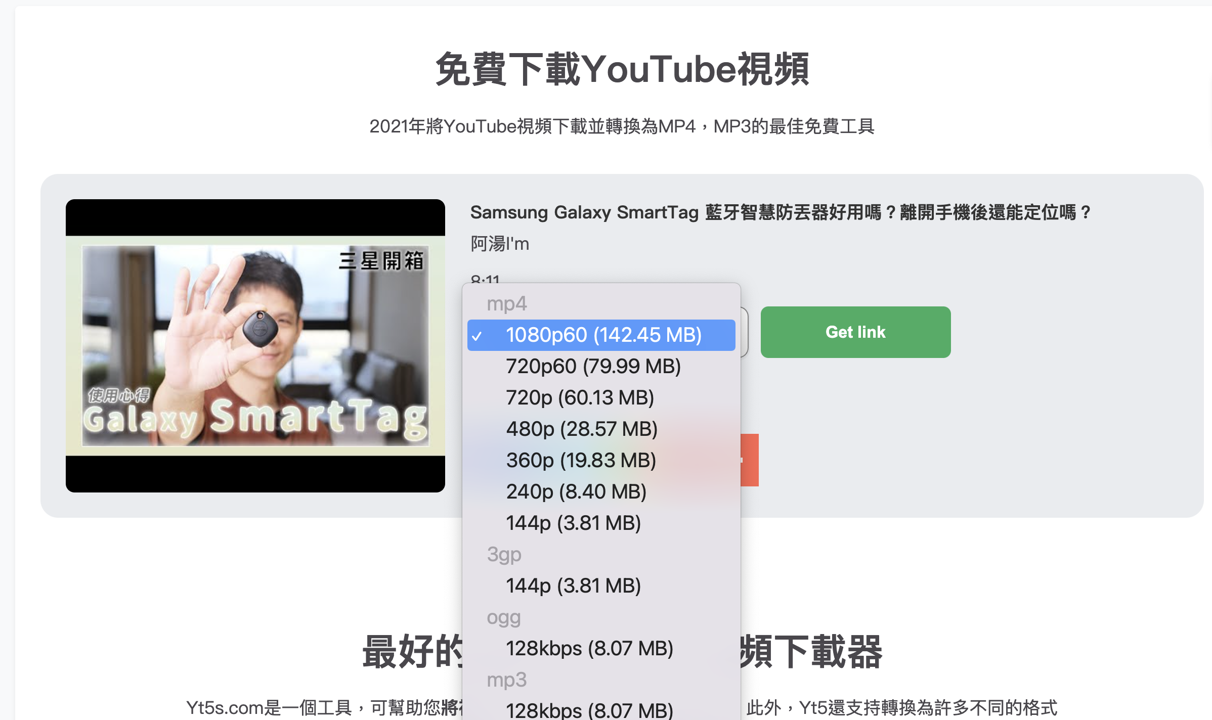 然後就可以選擇下載的解析度還有格式了,直接點擊 Get link 就會開始轉換。