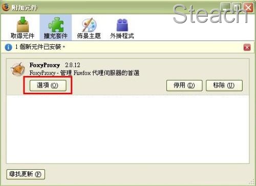 至工具→附加元件→擴充套件→FoxyProxy點擊選項,進入代理設定