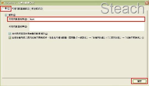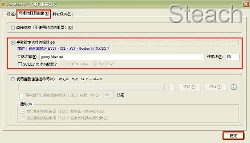 再來是代理伺服器細節,選擇中間的手動設定代理伺服將你欲掛上的代理填寫上去,例如hinet的代理主機是proxy.hinet.net 連接埠:80
