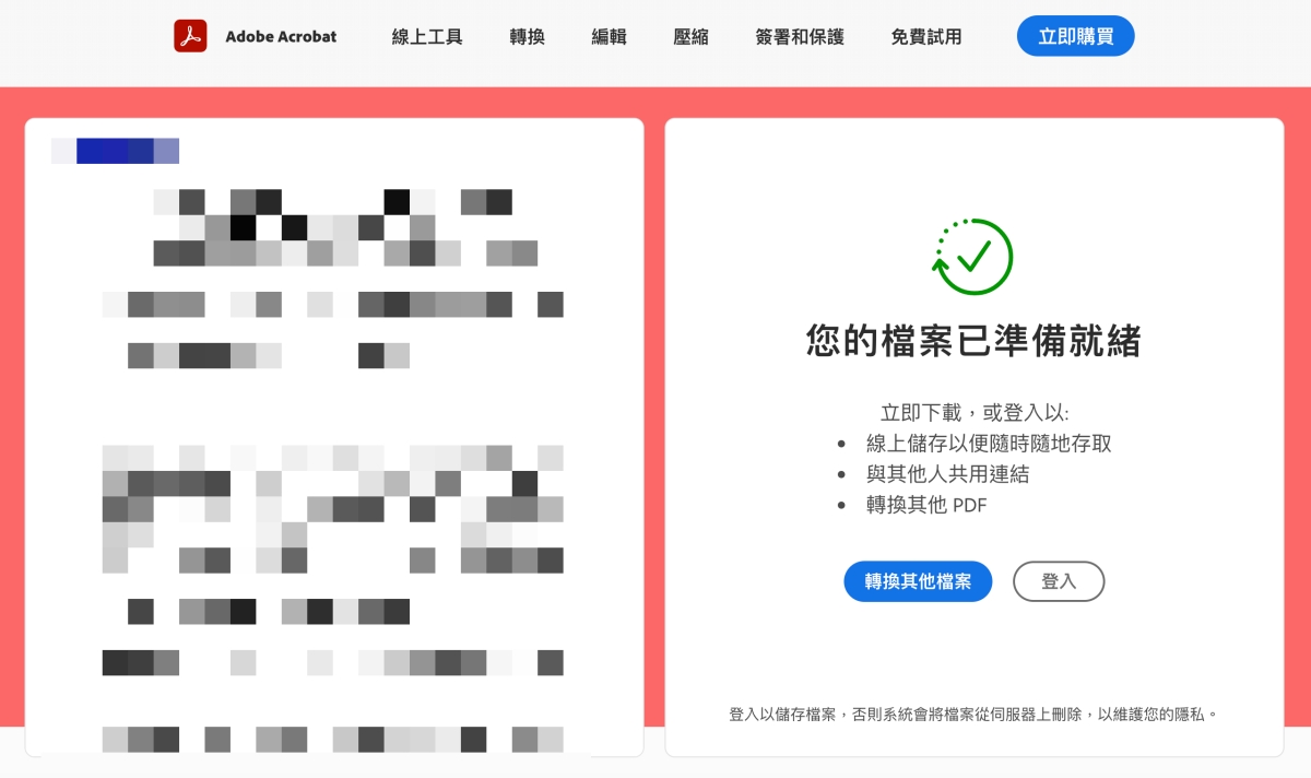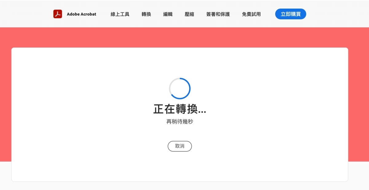 以 PDF 轉檔來說,上傳後就會跳來 Adobe Acrobat 的線上工具進行轉換,然後等待轉檔完成。