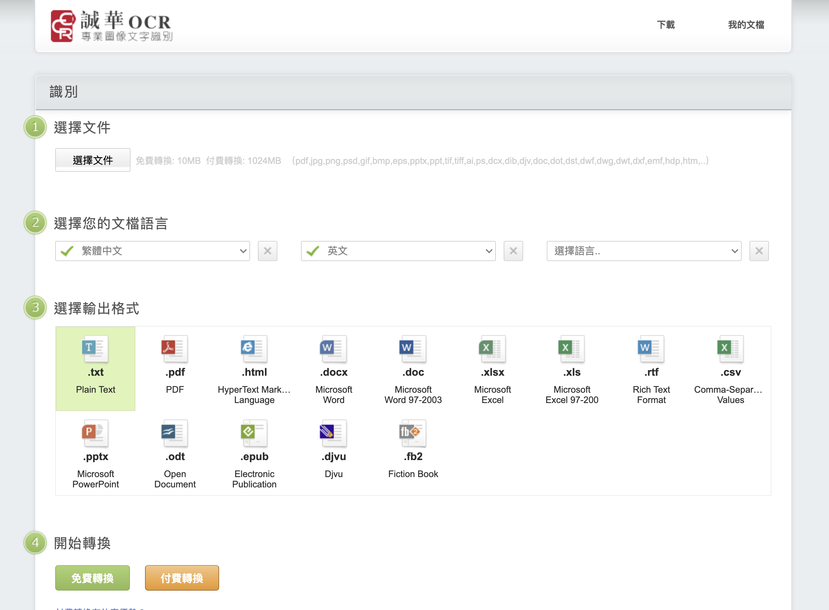 網站:https://zhtw.109876543210.com/進入網站後,直接選擇文件上傳檔案,這個網站有個好處是可以選擇 3 種主要的語言做為辨識,下方再選擇輸出格式就可以開始上傳,而免費的部份最多可以同時上傳 3 個檔案,每個檔案不超過 10mb,其實相當夠用了。