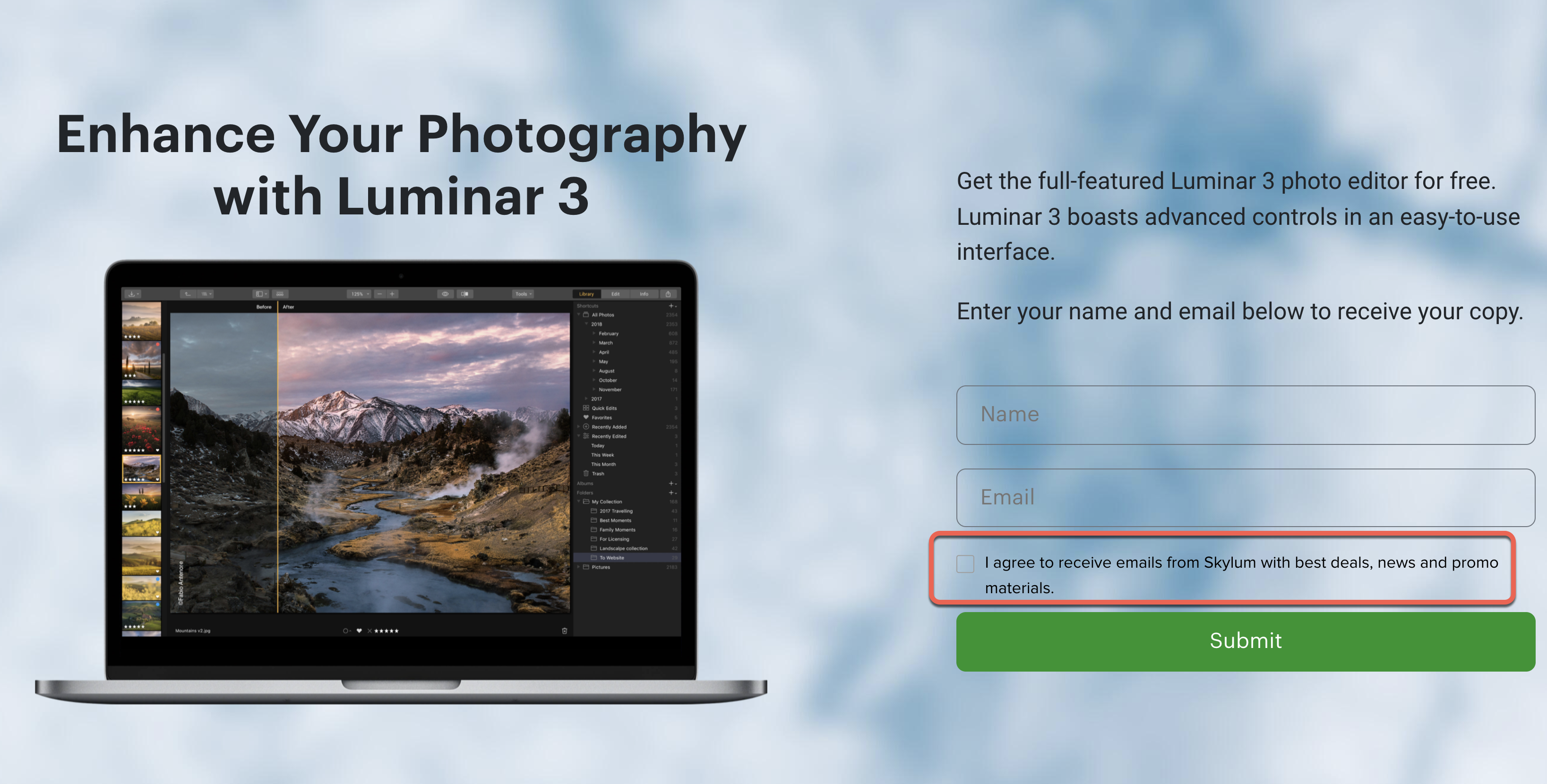 活動網址:https://skylum.com/es/l/chipcz-luminar進入活動網站後,填入姓名(隨便填)跟 Email(要填正確),送出就可以去收 Email。