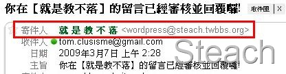 相信大家都知道不論是Wordpress或論壇程式,只要是由程式本身發出的信件,寄件者的資料都是類似像『admin@steachs.com』之類的,那如果哪一天有呆呆剛好有問題想問你,就直接由此信件回覆,那肯定是收不到啦,這個時候就必須讓系統發出時留下的寄件者資料,也是你的信箱,才不會漏了任何一封你的粉絲告白信哦!