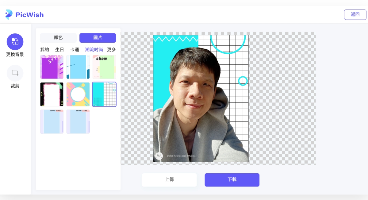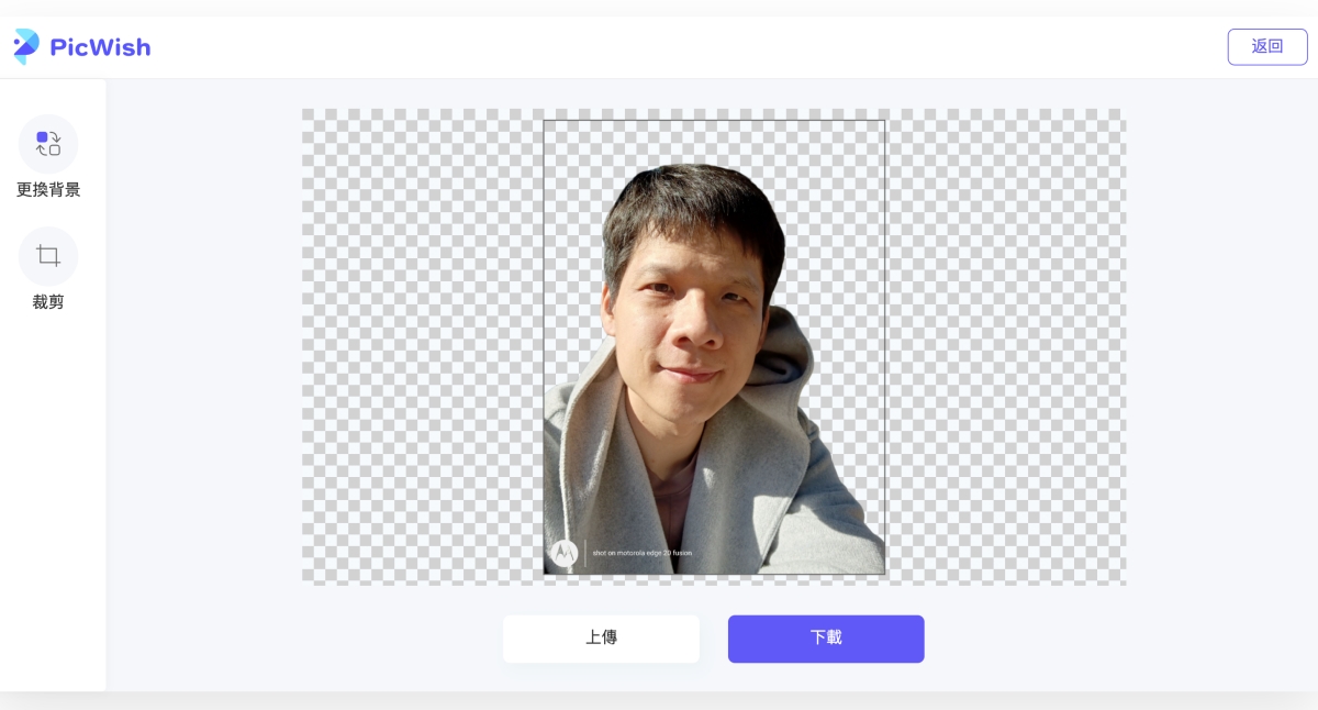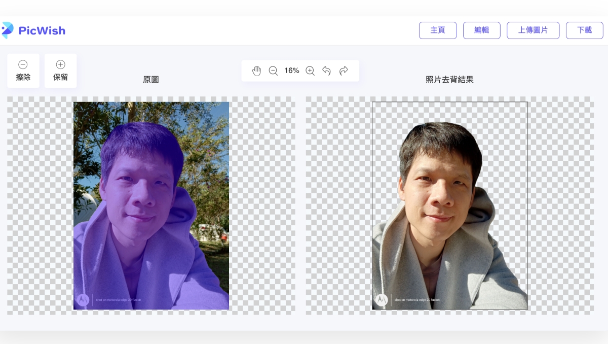 一上傳完立刻會顯示自動去背的成果,基本上只要人很明確,都會去背的很好,如果有沒去好的,也可以再用擦除跟保留來調整。