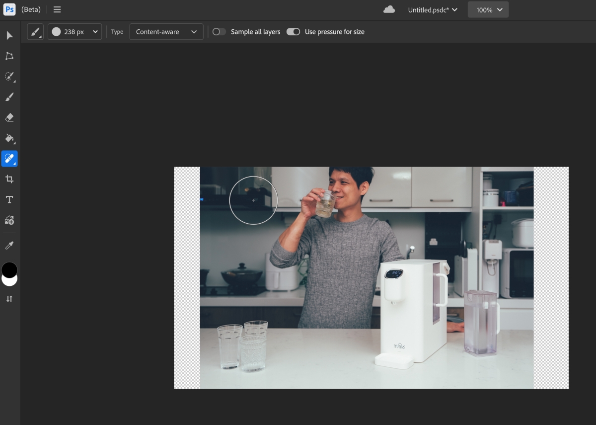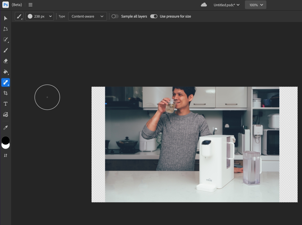比如阿湯先拉一張照片進來,給大家看一下汙損修復功能,目標是去掉桌上的杯子。