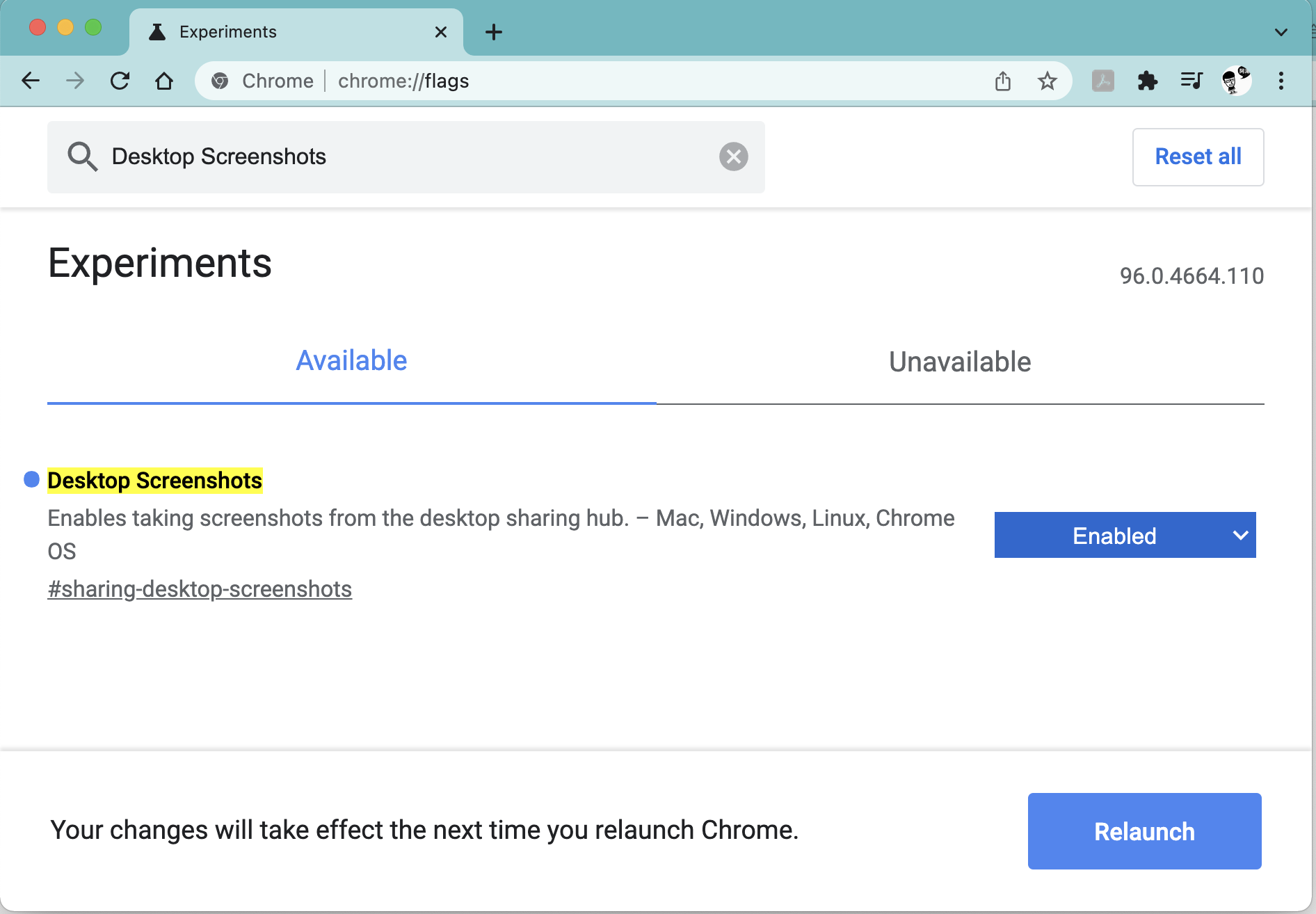 開啟瀏覽器後,在網址列輸入「chrome://flags」,然後在上方的搜尋列輸入「Desktop Screenshots」,找到後將這個選項改為 Enabled,然後按下方的 Relaunch 重啟瀏覽器就可以了。