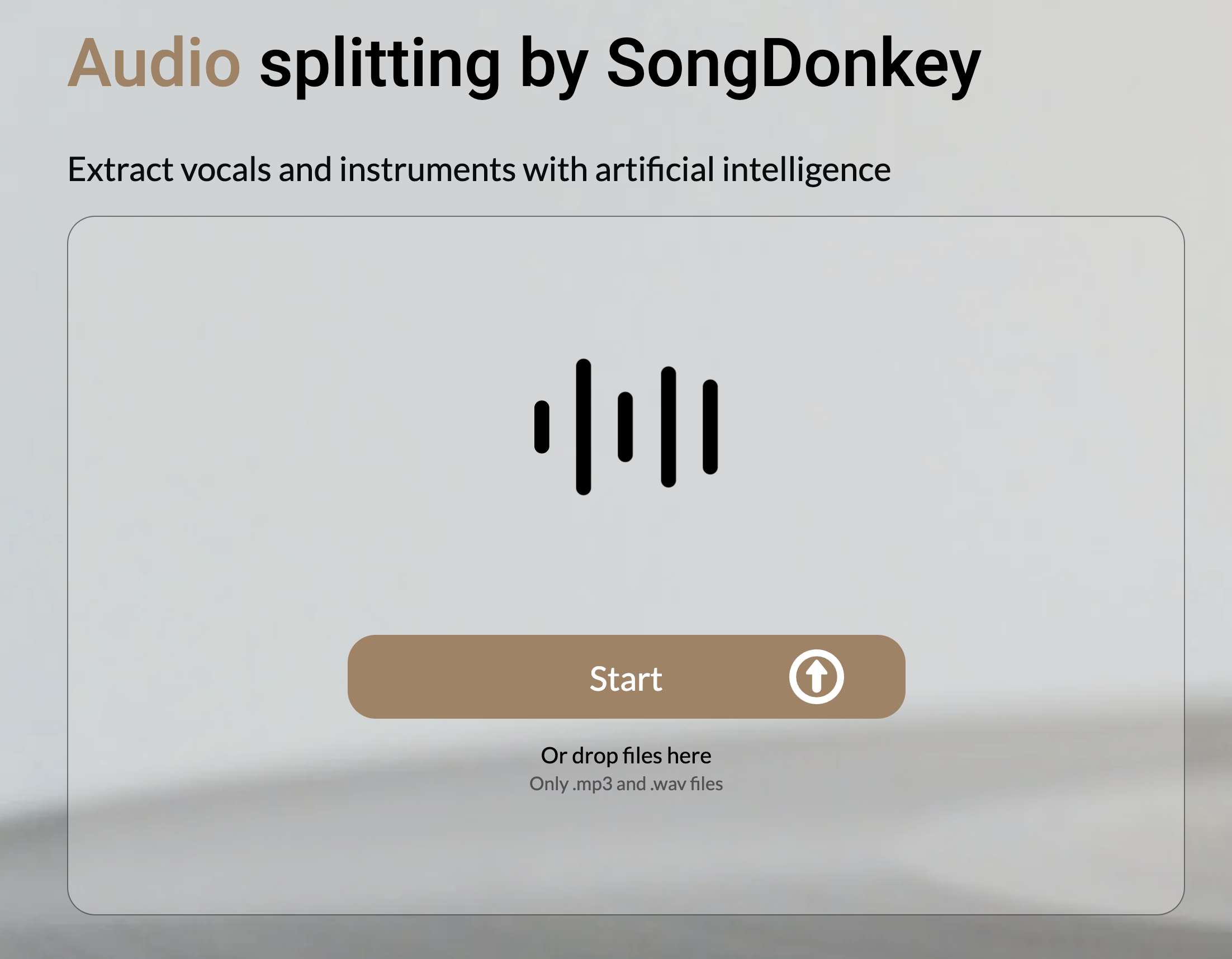 網站:https://songdonkey.ai/進入網站後,按下 Start 上傳檔案,或者直接把音樂檔案拖曳進視窗也是可以的。