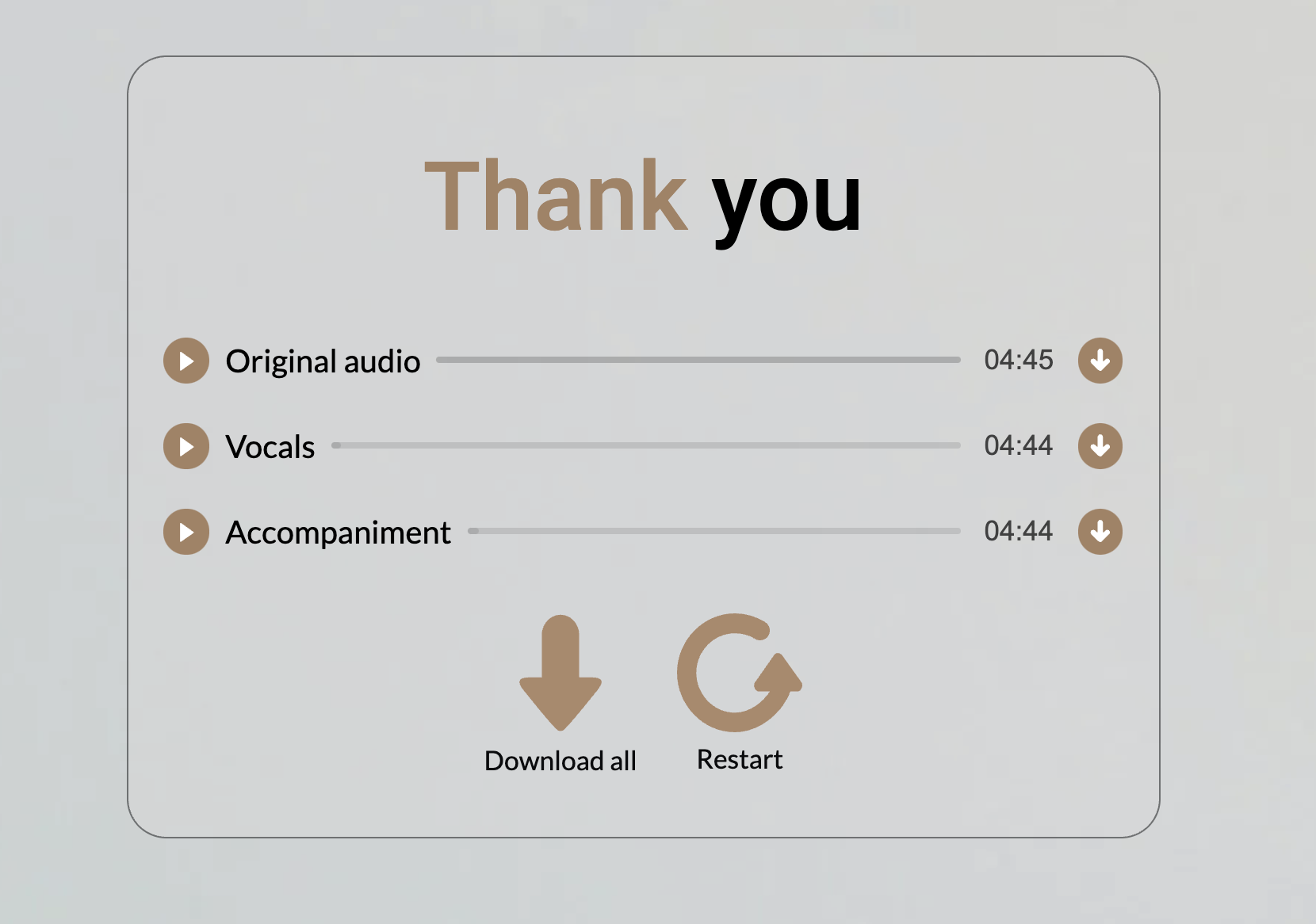 依音樂的時間長度等待時間也會有所不同,完成後會分別提供你原始聲音、人聲跟背景音樂三種可以選擇下載,去試看看吧,阿湯測試下來大致上都還去的蠻不錯的。