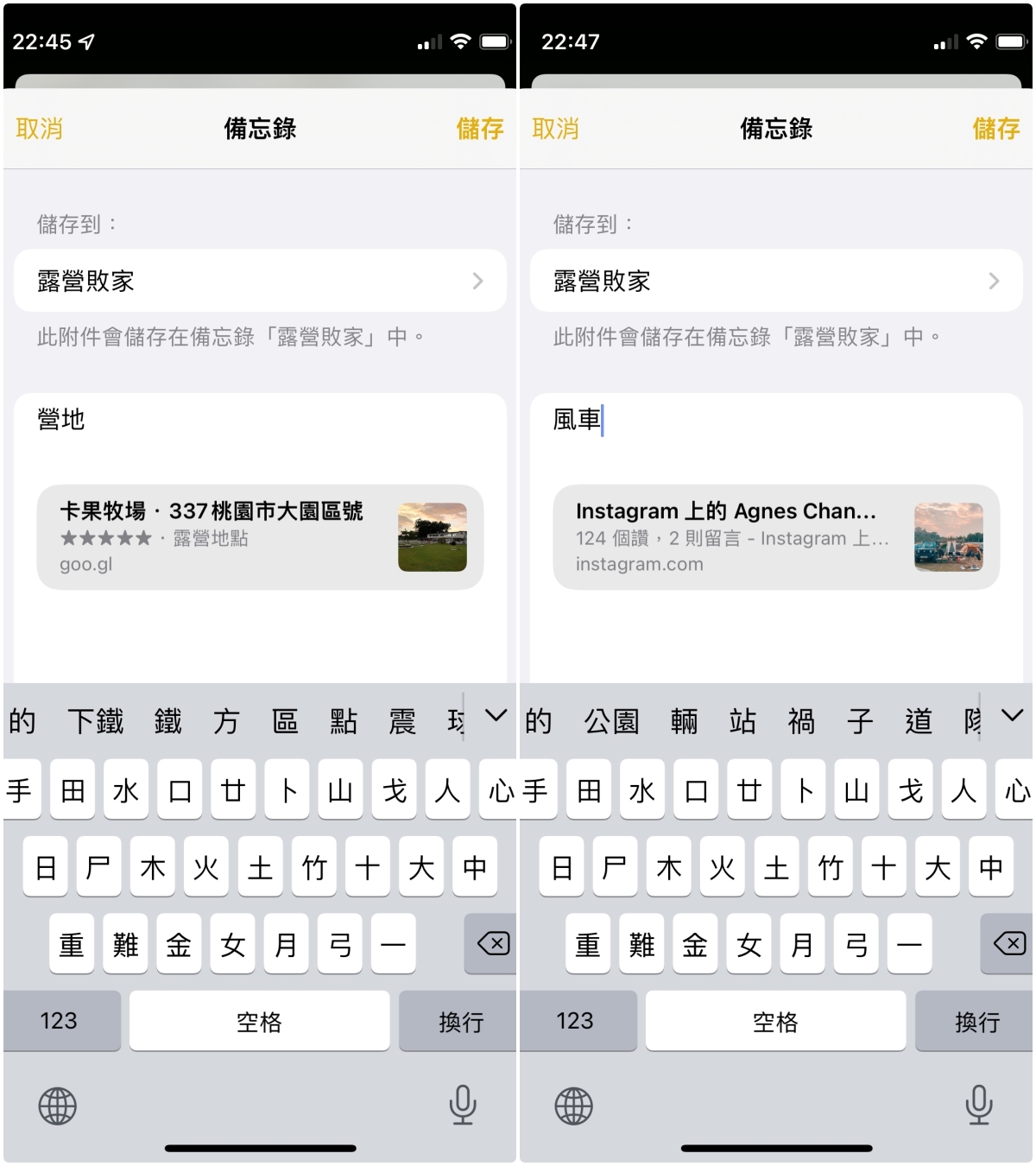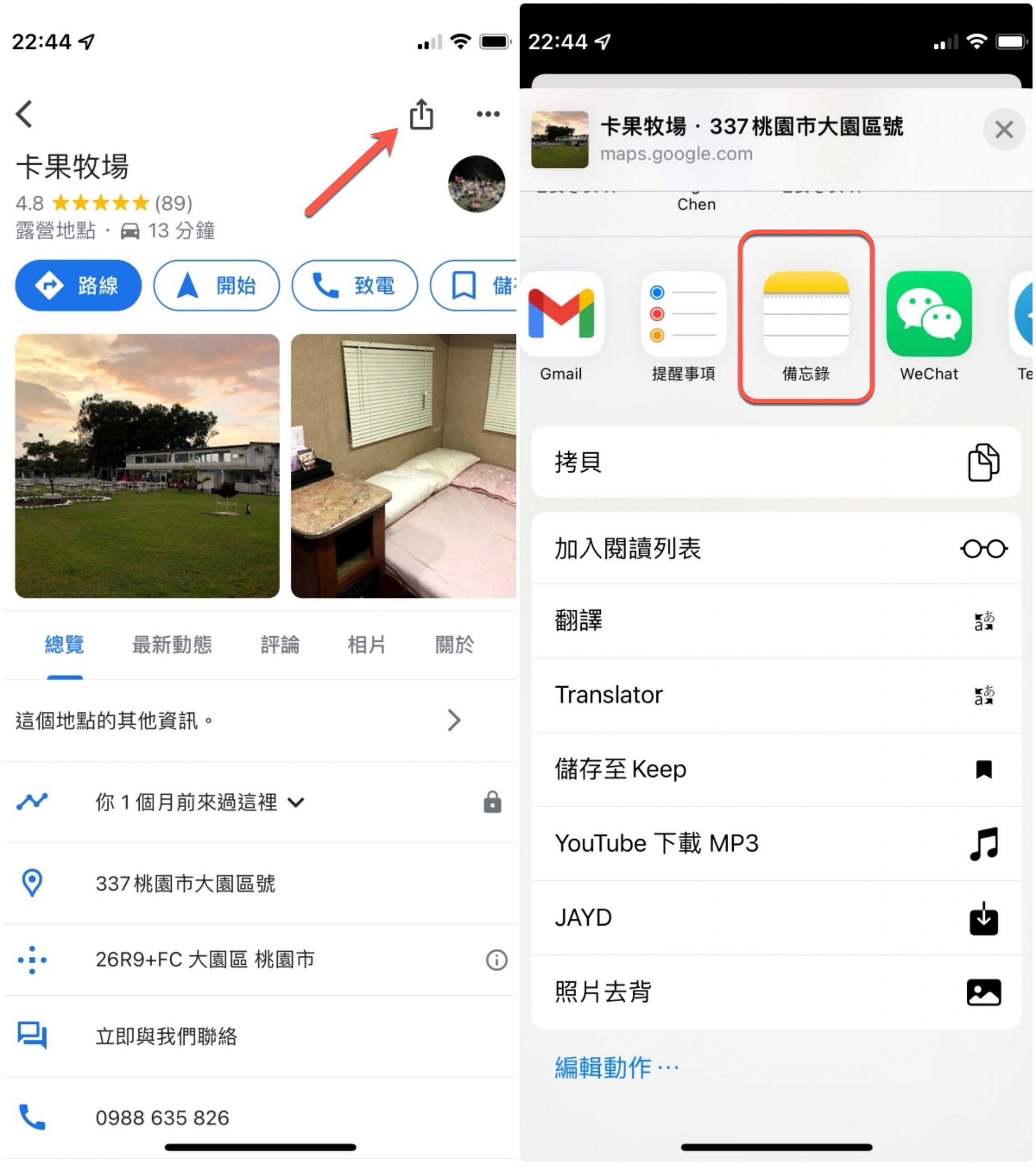 比如像 Google Map,一樣點擊分享後按下備忘錄,然後儲存。
