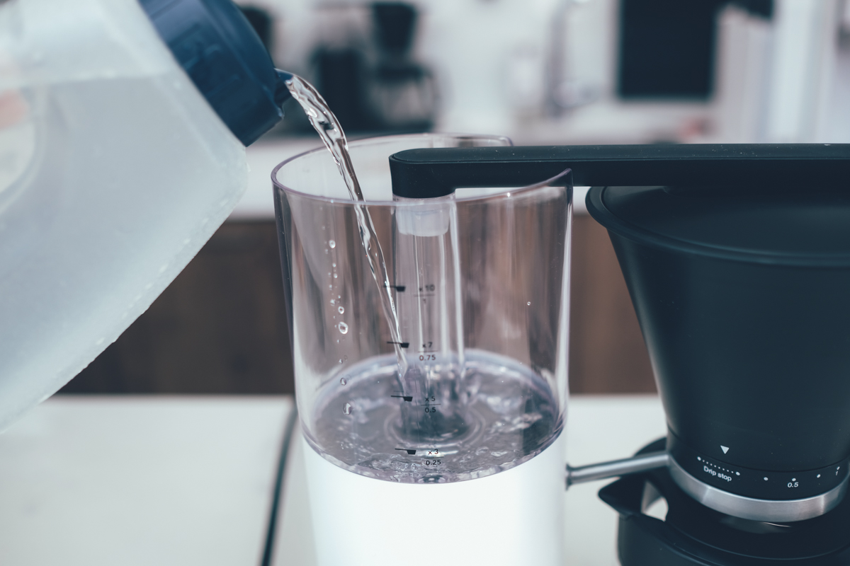 首先我們來看一下加水區,上方是已經有標好各種刻度,比如三個高度的水溫是 7 匙 / 0.75,代表著如果你要泡 0.75 公升(750ml)的咖啡,就把水加到這個水位線,並且在濾杯加入七匙咖啡粉。