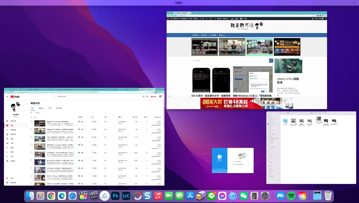 先來看一下 macOS 除了 Command + Tab 外,其實阿湯自己很慣用的是在滑鼠上雙指輕點二下,就會在視窗上列出全部的視窗,這我也覺得很方便,但有些人應該就習慣用 Alt + Tab。