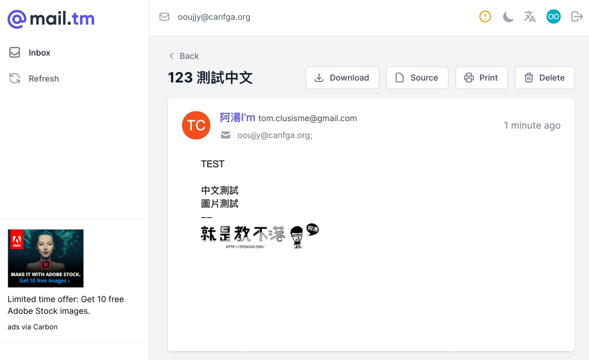 測試了文字圖片及附件,都可以正常顯示及下載,所以算是相當不錯的臨時郵件服務。