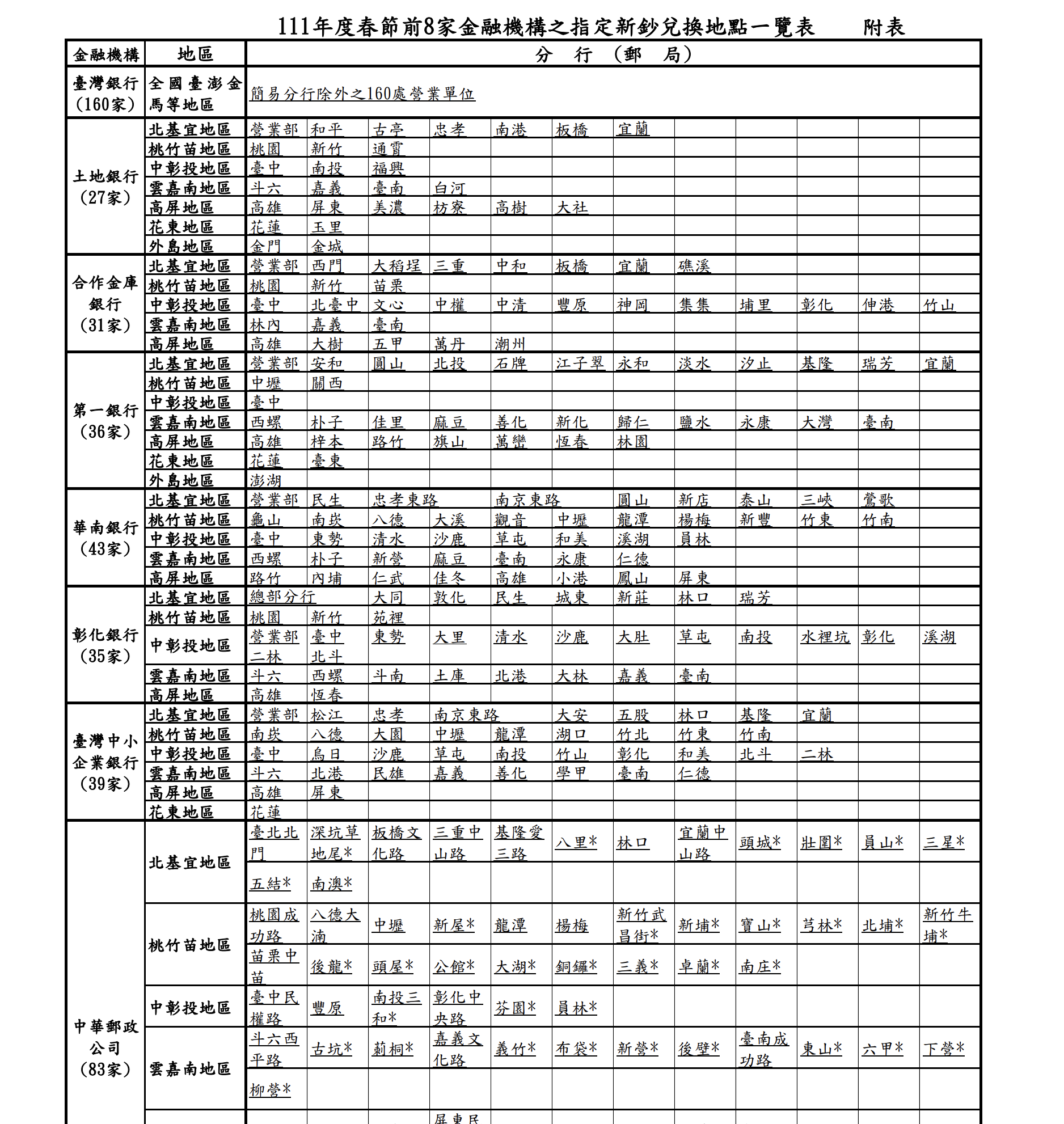 111 年度春節前 8 家金融機構之指定新鈔兌換地點一覽表 https://www.cbc.gov.tw/tw/dl-181373-2dfac14accaa480b9c3c668ab53fa016.html這份 PDF 檔案包括了前 8 家金融機構可以兌換新鈔的地點,點擊分行名稱都會自動連結至 Google 地圖,方便查看地點。