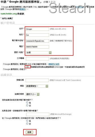 填寫申請資料,選填紅框的部份,下面的組織資訊空白即可