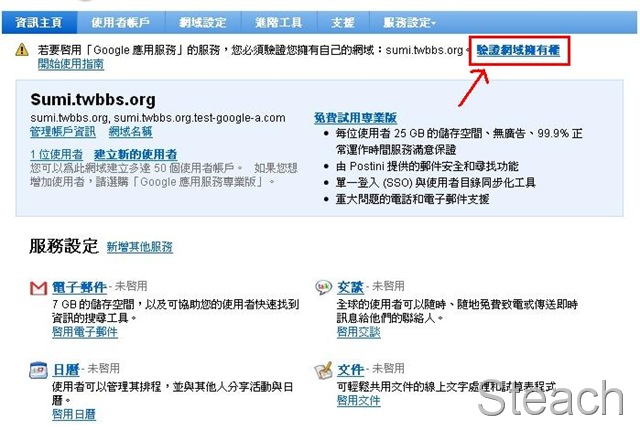 服務介紹:用自己的網域來綁定Google網路應用服務,像是Gmail、Google文件、Google日曆、Google Talk、Google Sites協作平台等。