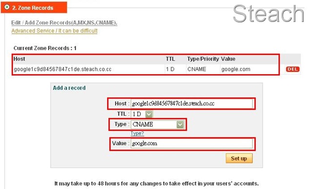 Type選擇CNAME,Value輸入google.com,按下Set up即可