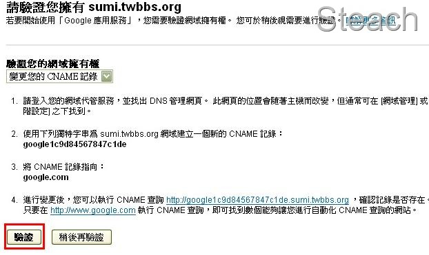 驗證方法請選擇〝變更你的CNAME記錄〞下方會出現一串文字google1c9d……是用來讓你綁在網域上以確認域名是否你所有可先按下驗證,也可先不按,下面站長提供了Co.cc及twbbs.org二種網域分別綁上驗證字串的方法!