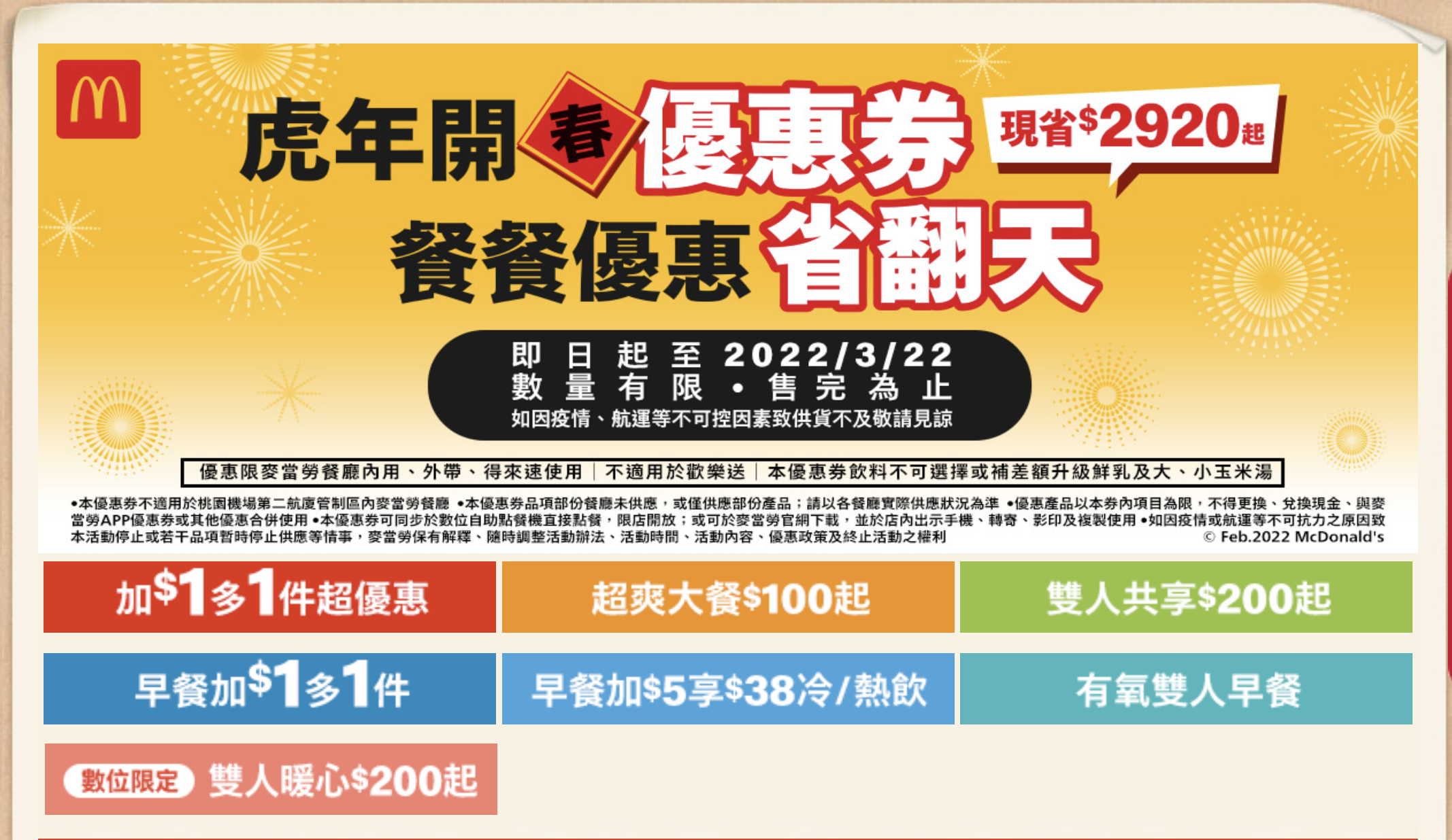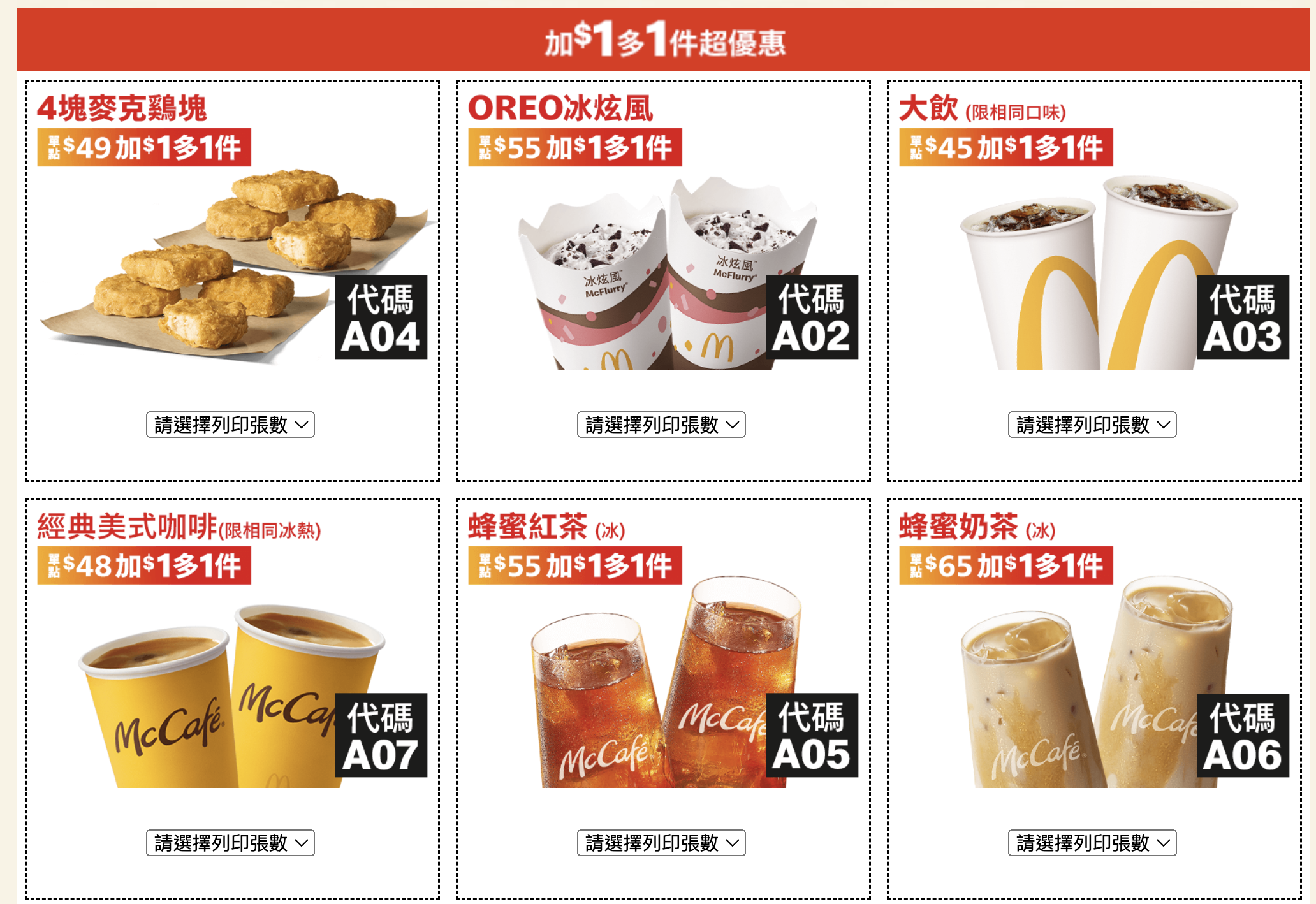 活動網站:https://campaign.mcdonalds.com.tw/2022CNYCoupon/進入網站後像這樣,直接選擇需要的優惠券,然後右上就可以列印,或者是直接用手機掃描 QR Code 到櫃台直接出示就好,像下面這是加一元就多一件,單點非常的划算。