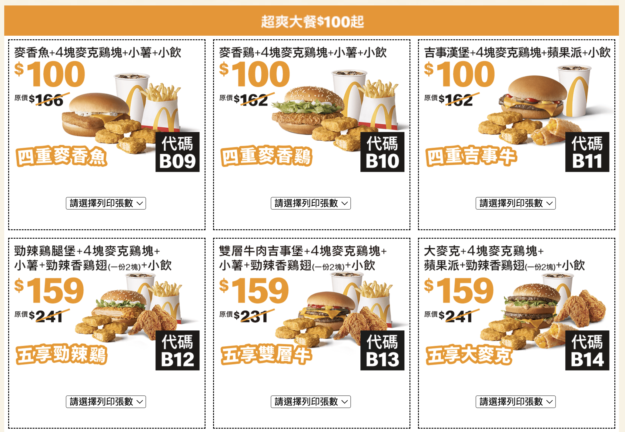 然後部份一般餐點也從原價直接都變 100 塊,其它進入網站往下查看還有很多,都折價超多,難得我覺得麥當勞是便宜的了.....