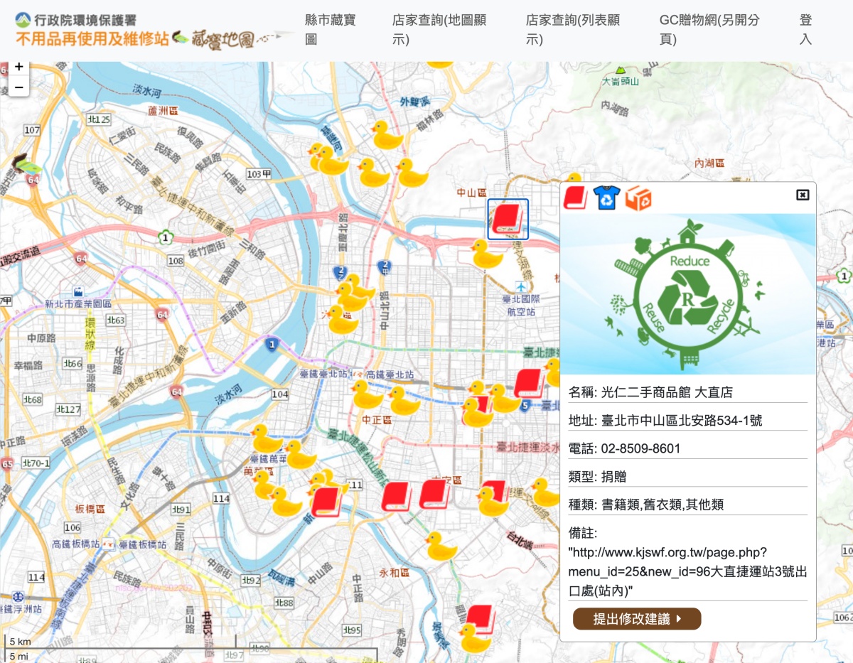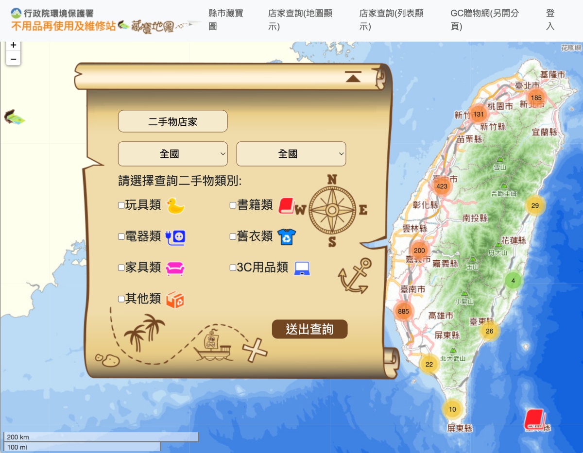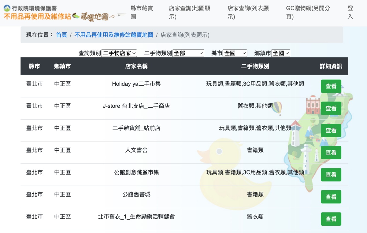網站:https://recycle.epa.gov.tw/utmap/MapQry進入網站後直接選擇區域跟二手物類別,然後就可以進行搜尋。